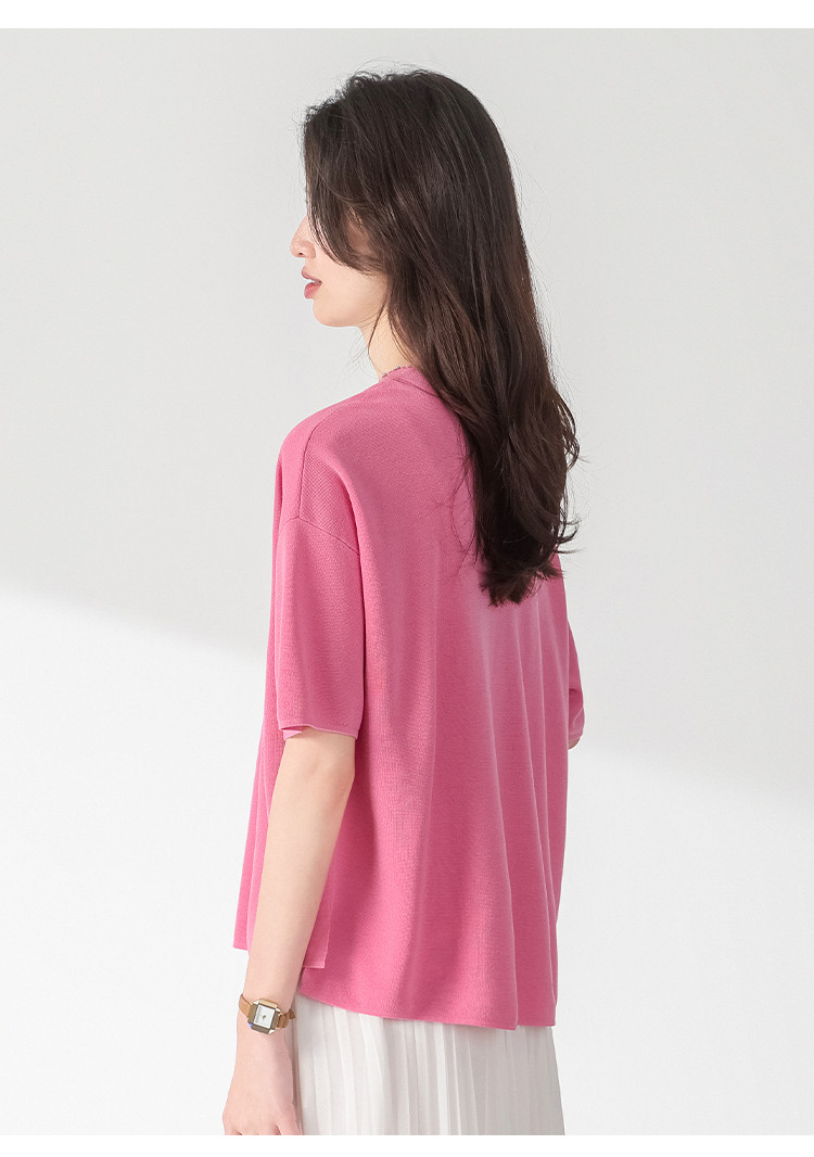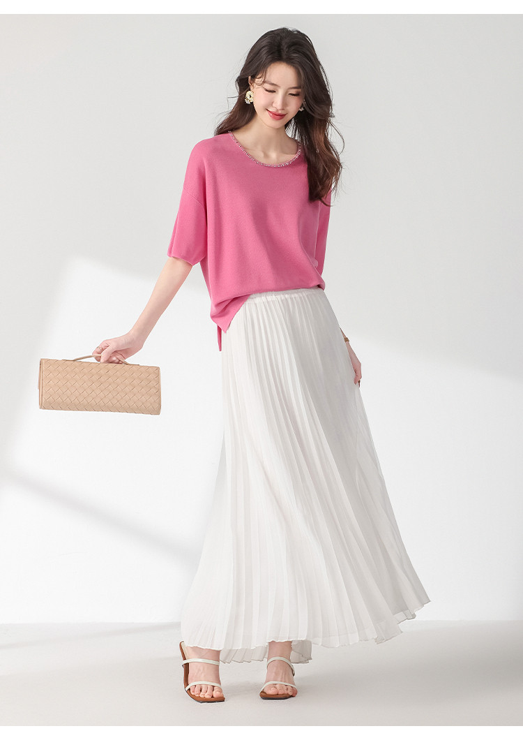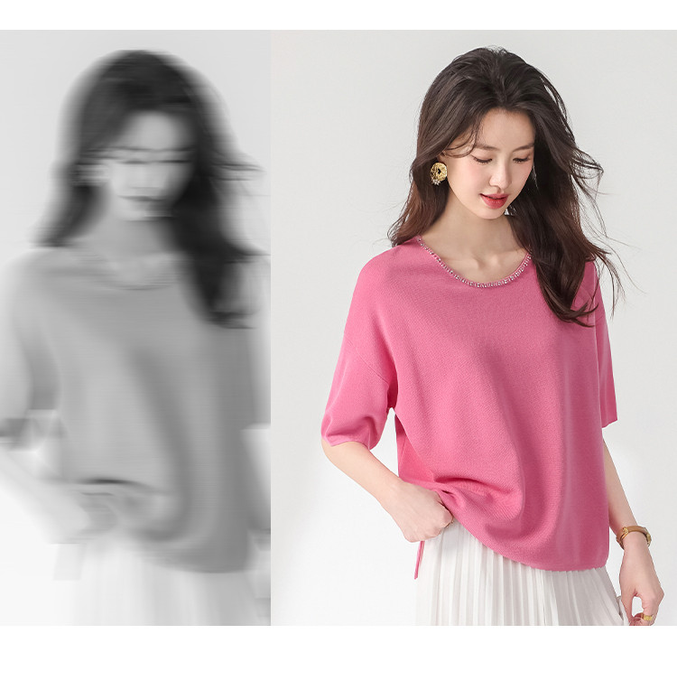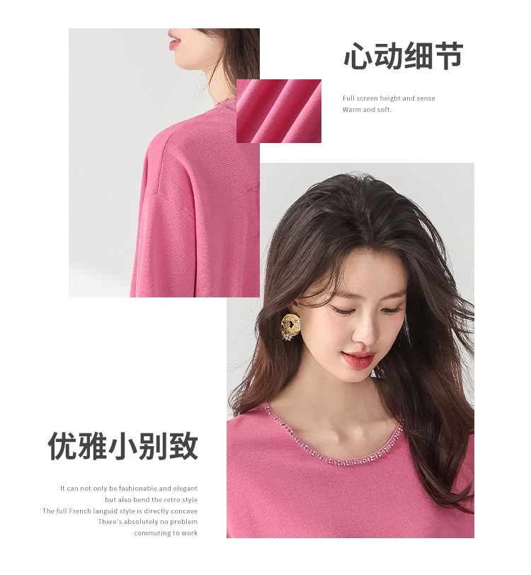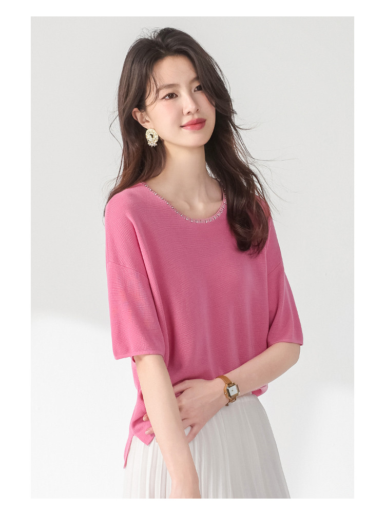 商品名称:圆领钉珠针织衫女套头纯色含羊毛短袖T恤针织衫春装气质上衣 358227