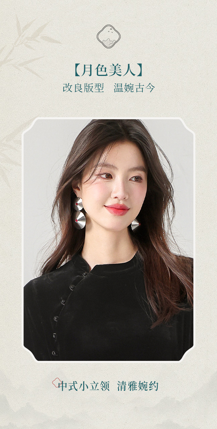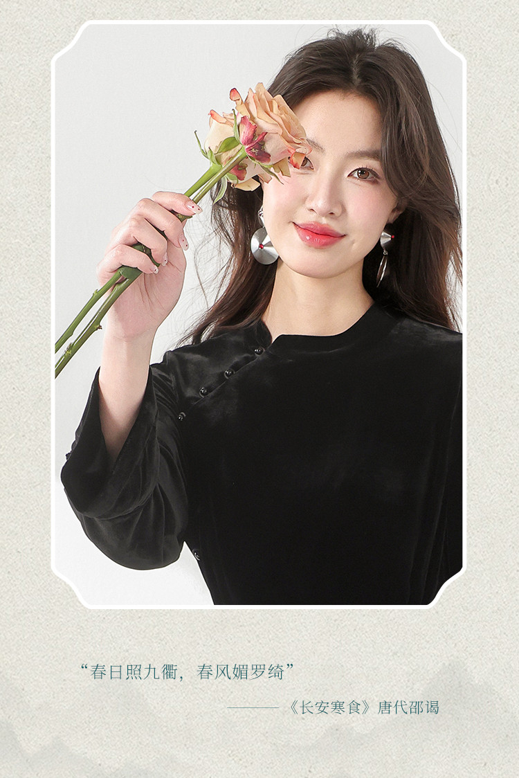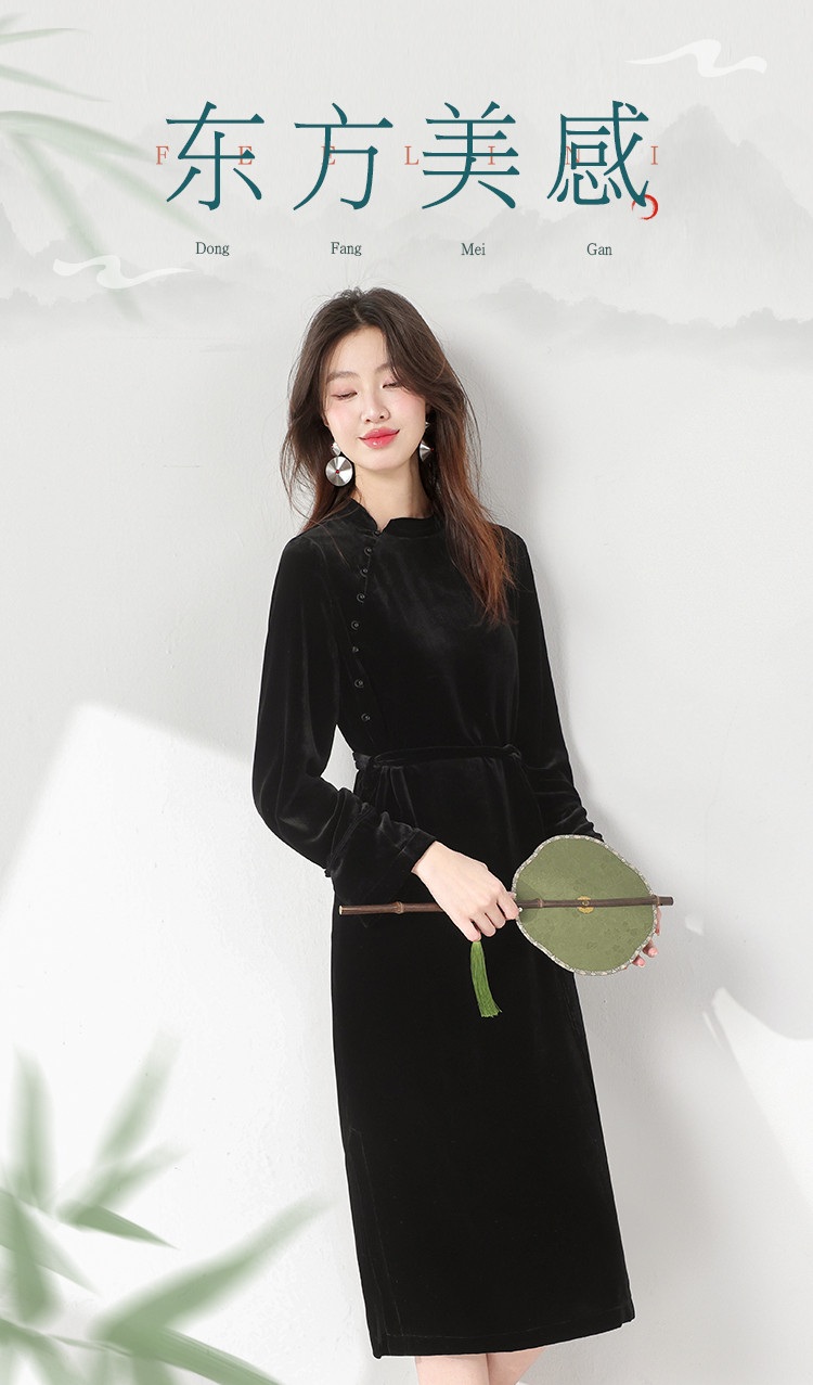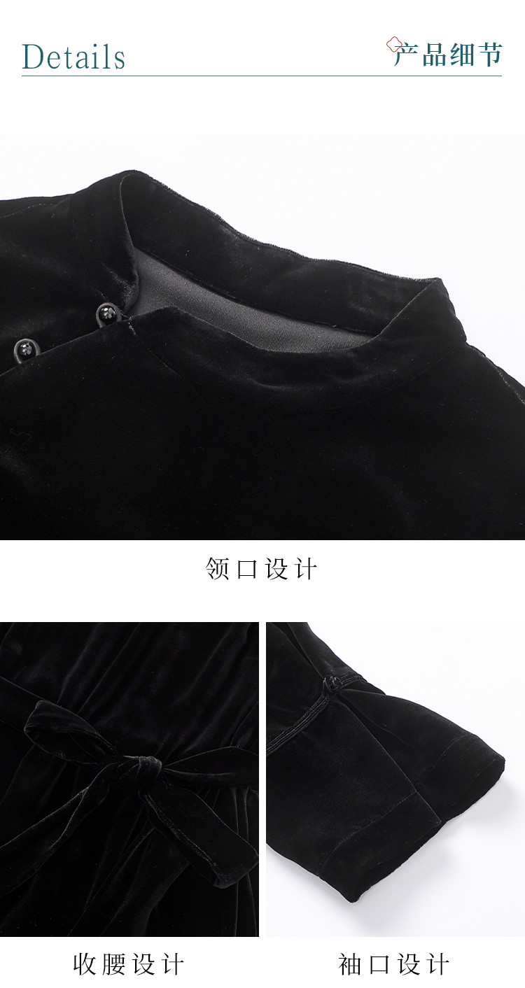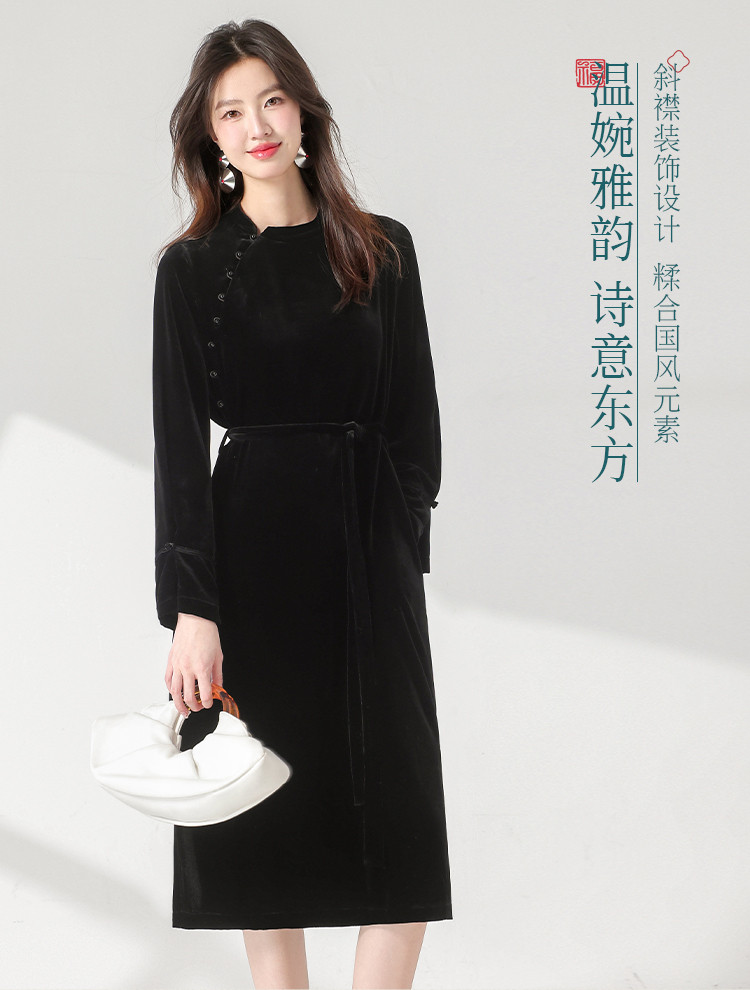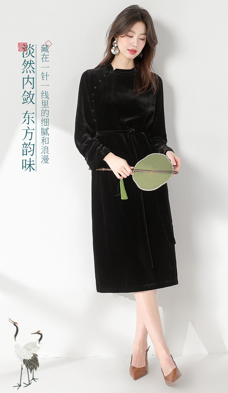 商品名称:【桑蚕丝】国风新中式立领纯色系带丝绒裙子气质长袖真丝连衣裙女 868371