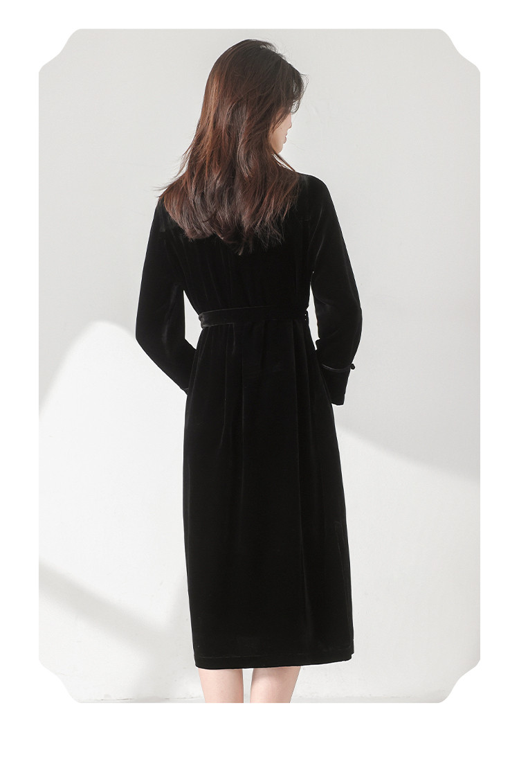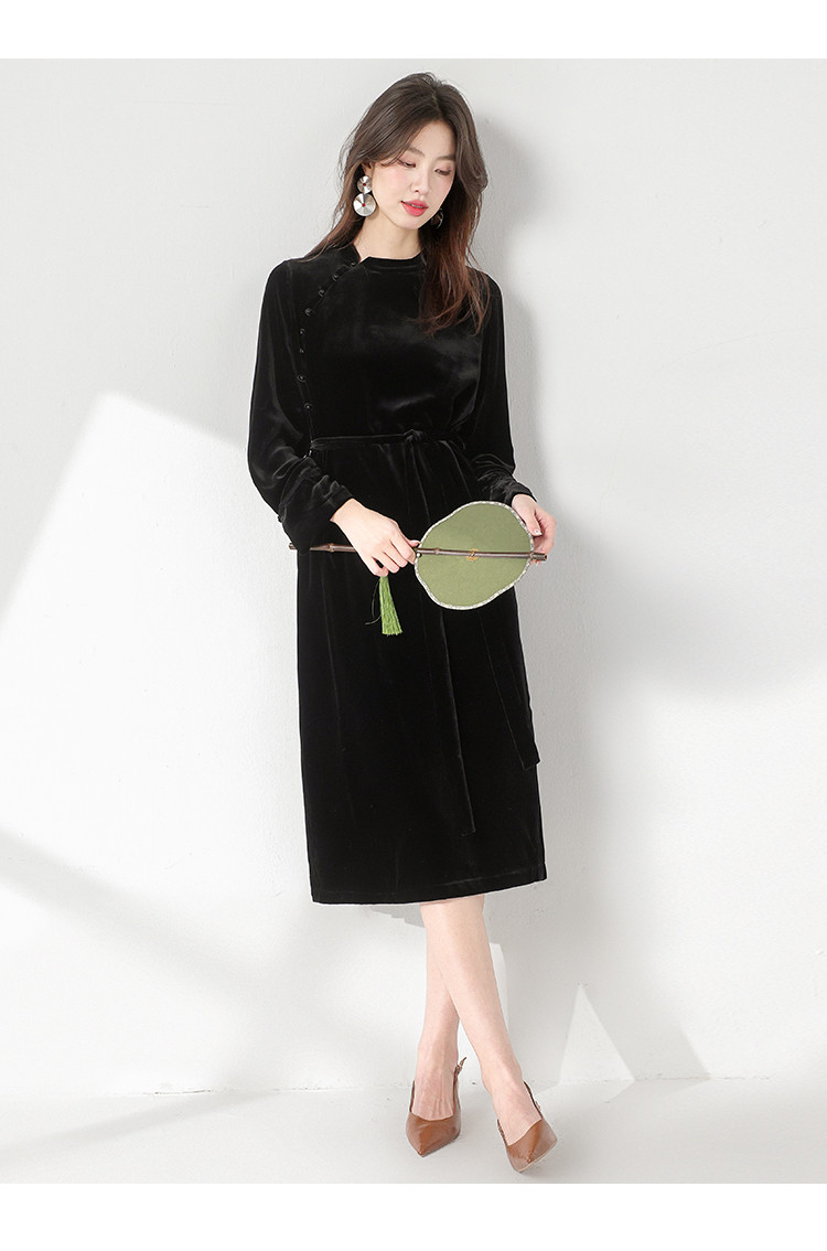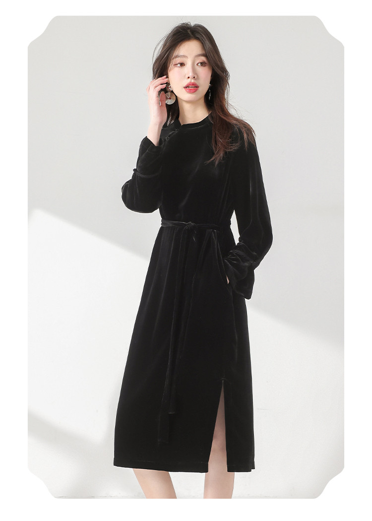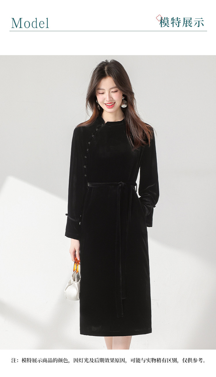 【桑蚕丝】国风新中式立领纯色系带丝绒裙子气质长袖真丝连衣裙女 868371