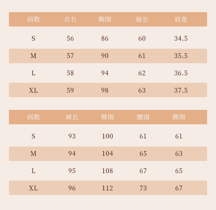 | 尺码 | 肩宽(cm) | 袖长(cm) | 上装号型 | 下装号型 | 衣长(cm) | 腰围(cm) | 裤长(cm) | 臀围(cm) | 胸围(cm) | 号型 |