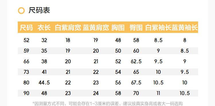 | 尺码 | 衣长(cm) | 肩宽(cm) | 身高(cm) | 臀围(cm) | 袖长(cm) | 适合年龄 | 胸围(cm) | 号型 |