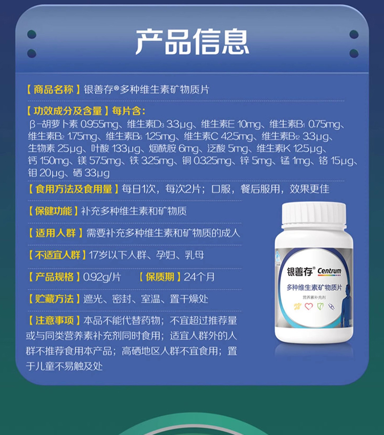 商品名称:善存中老年男士银善存复合维生素多种矿物质片160片B族vc钙维d营养保健品