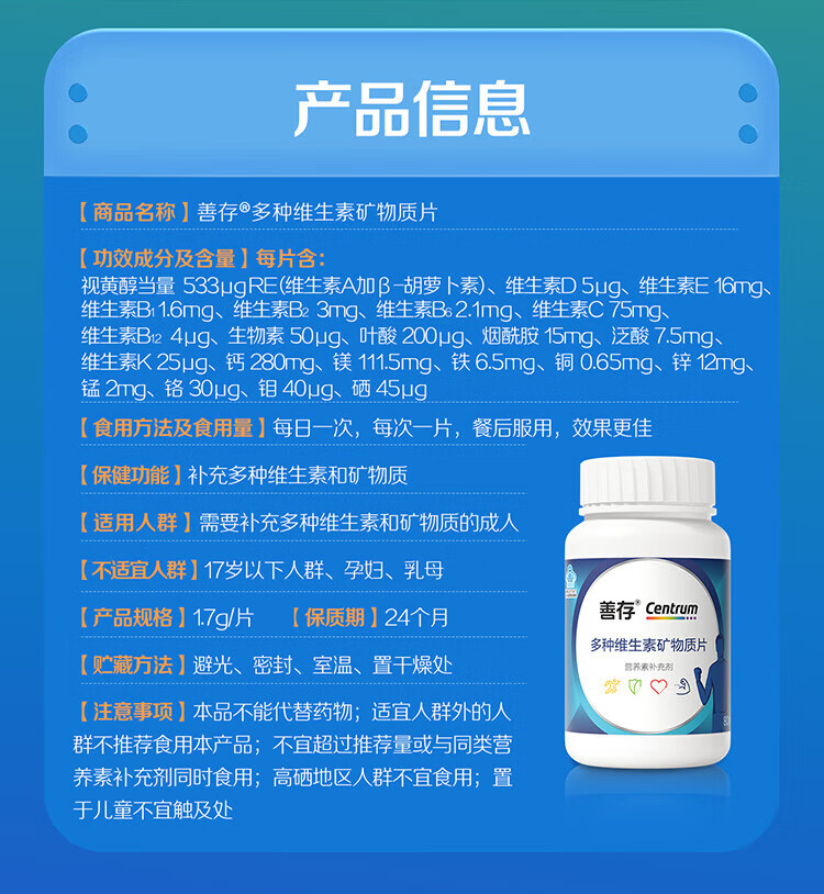 商品名称:善存男士复合维生素多种矿物质片40片成人男性多维B族VC维D钙锌硒片