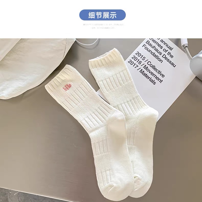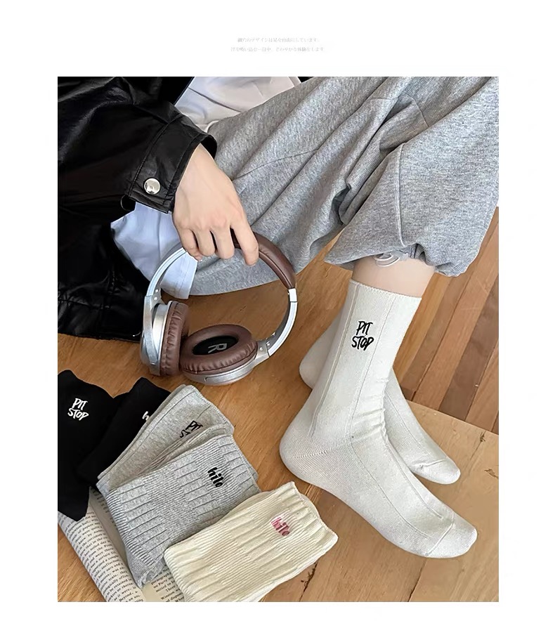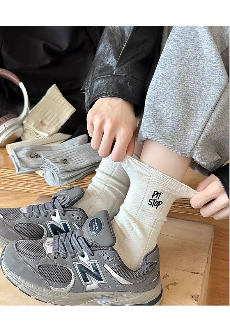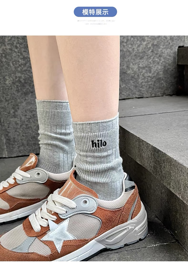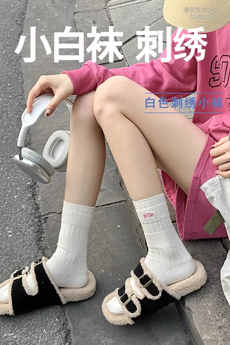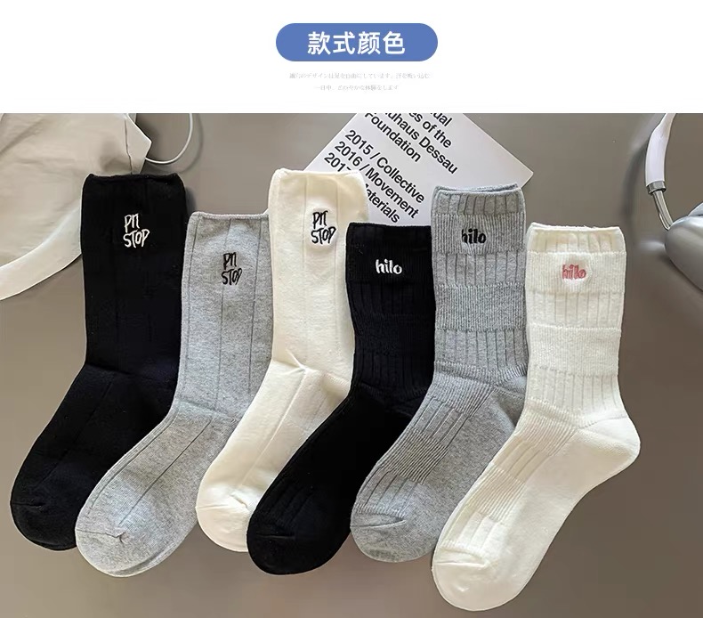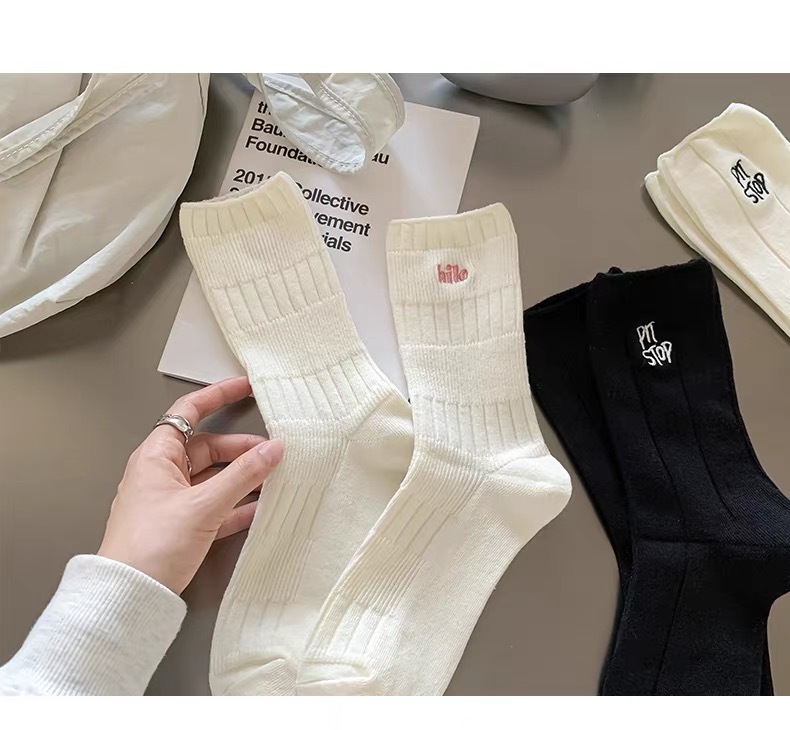 商品名称:【5双装】朝暮栖止双针刺绣字母袜子女中筒简约堆堆袜高弹松口精梳棉袜显瘦