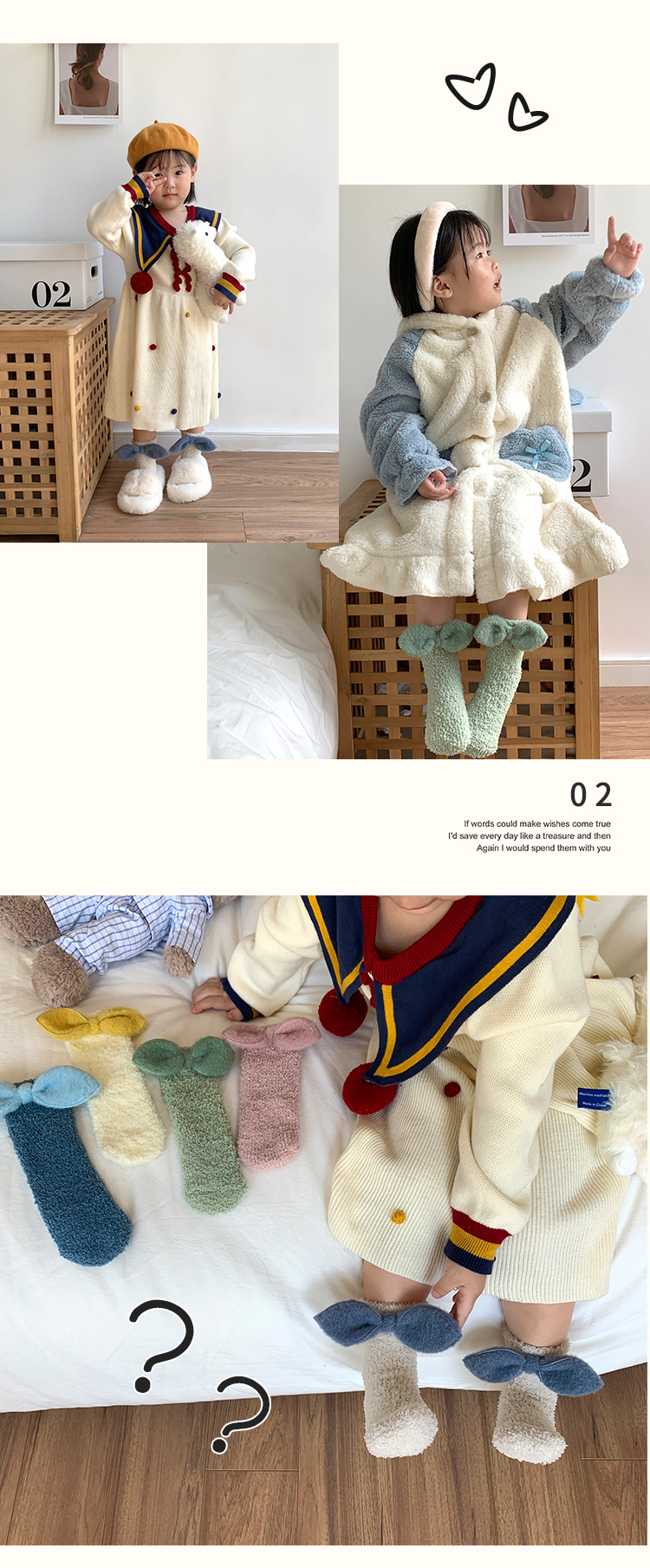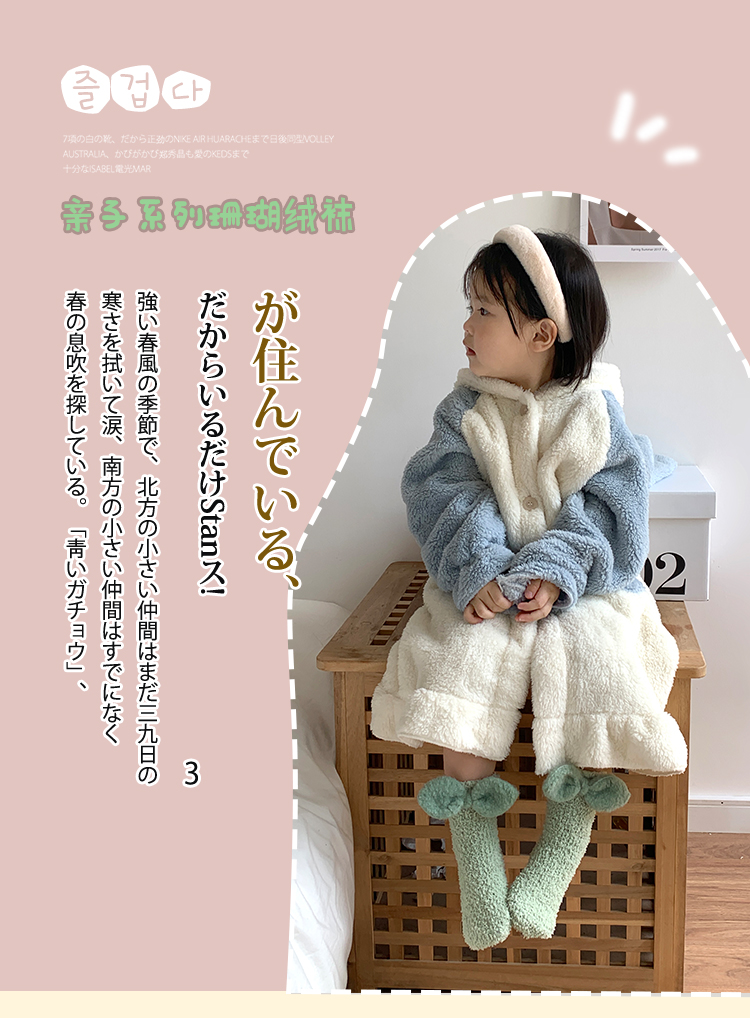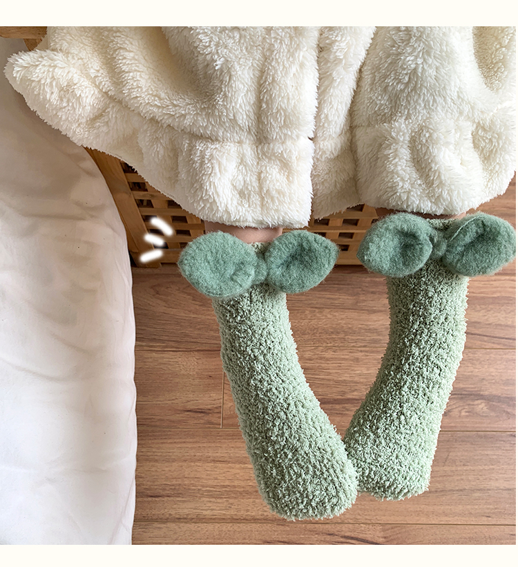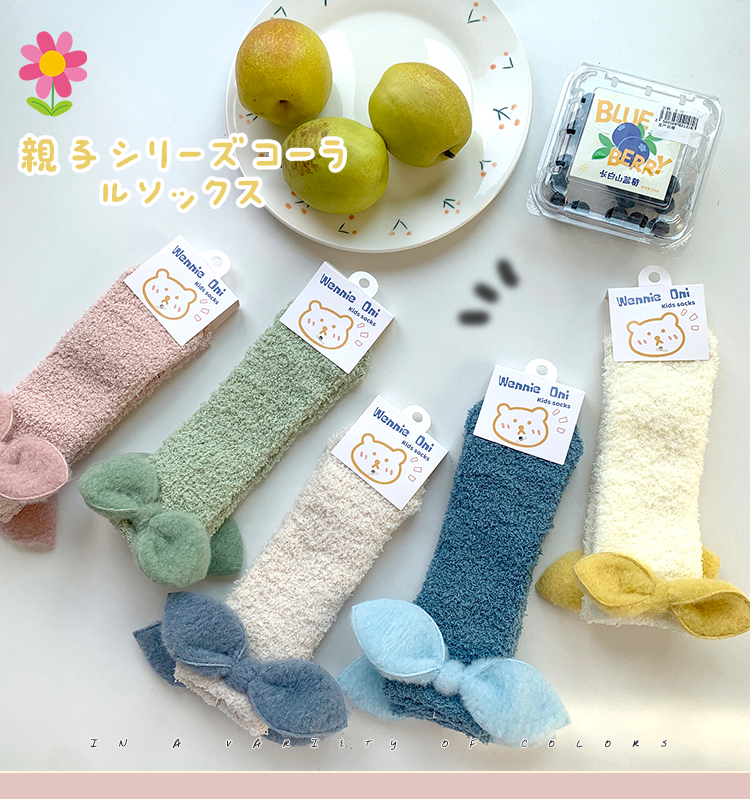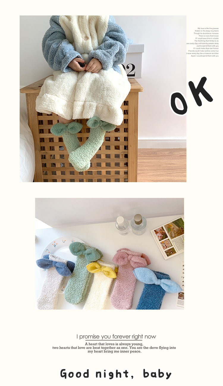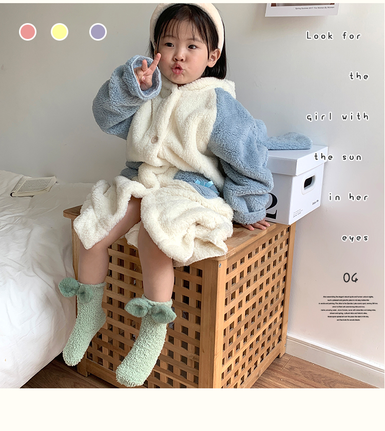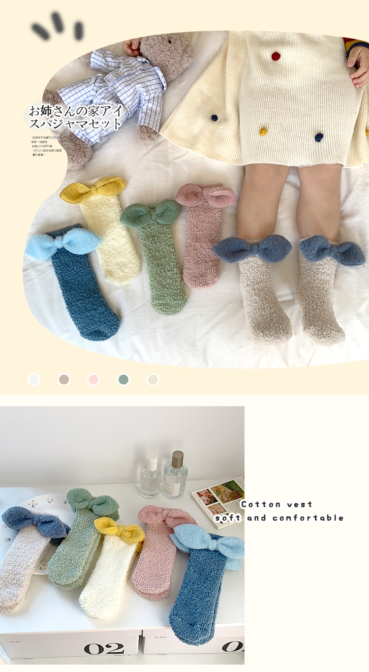 商品名称:【5双装】 朝暮栖止蝴蝶结珊瑚绒儿童袜子女毛毛绒地板袜睡眠袜保暖冬中筒袜