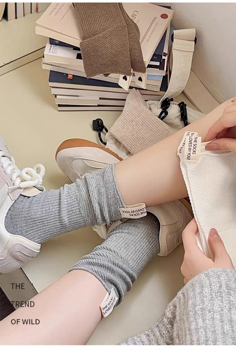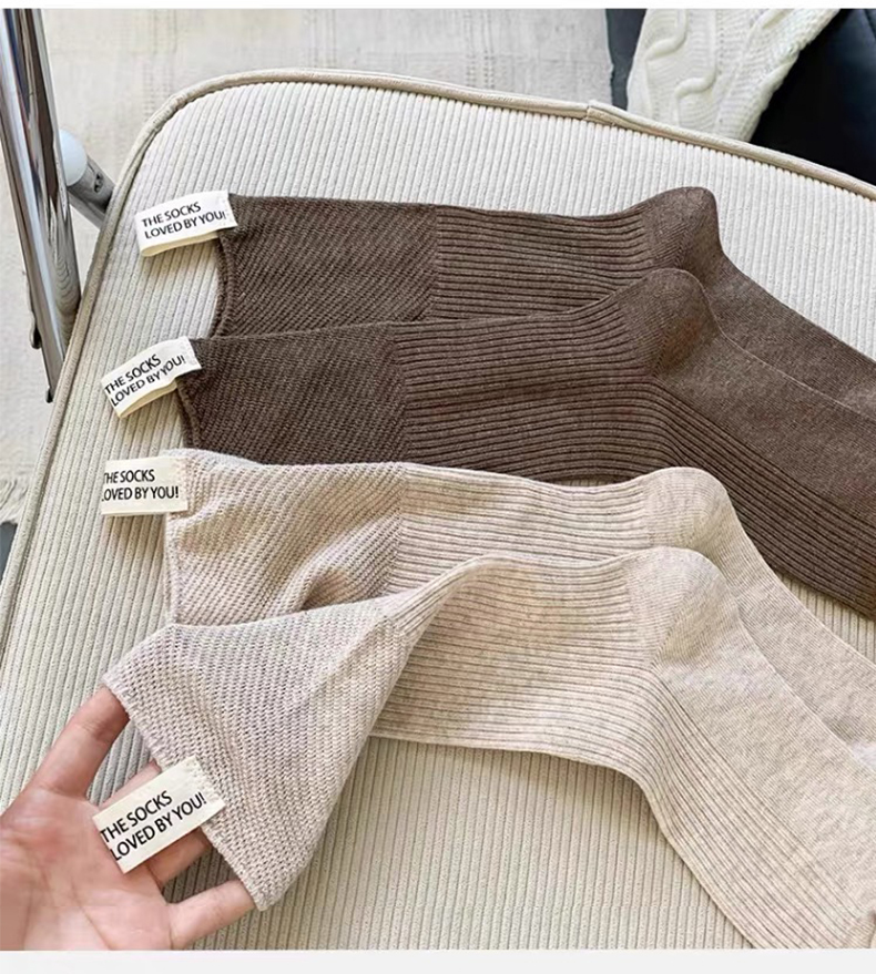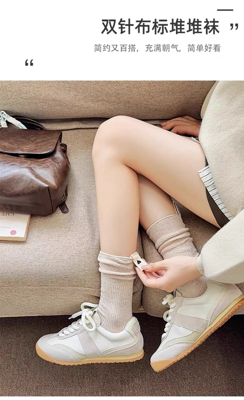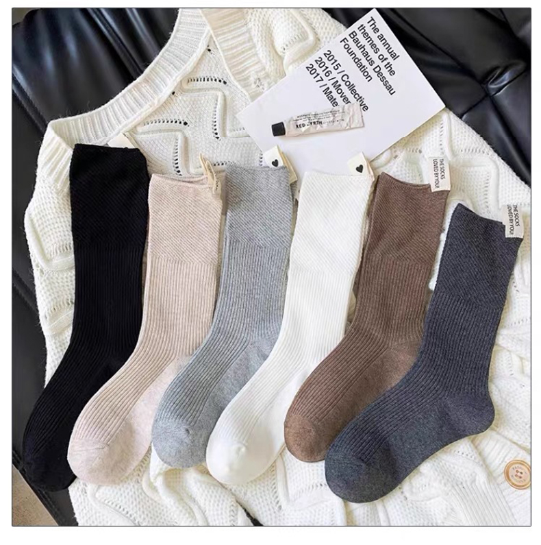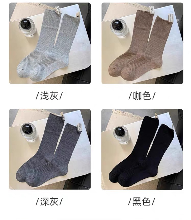 【5双装】朝暮栖止后跟布标中筒袜子个性少女小腿袜粗线双针网眼镂空堆堆袜