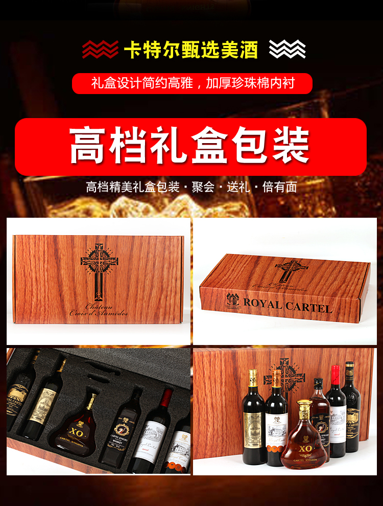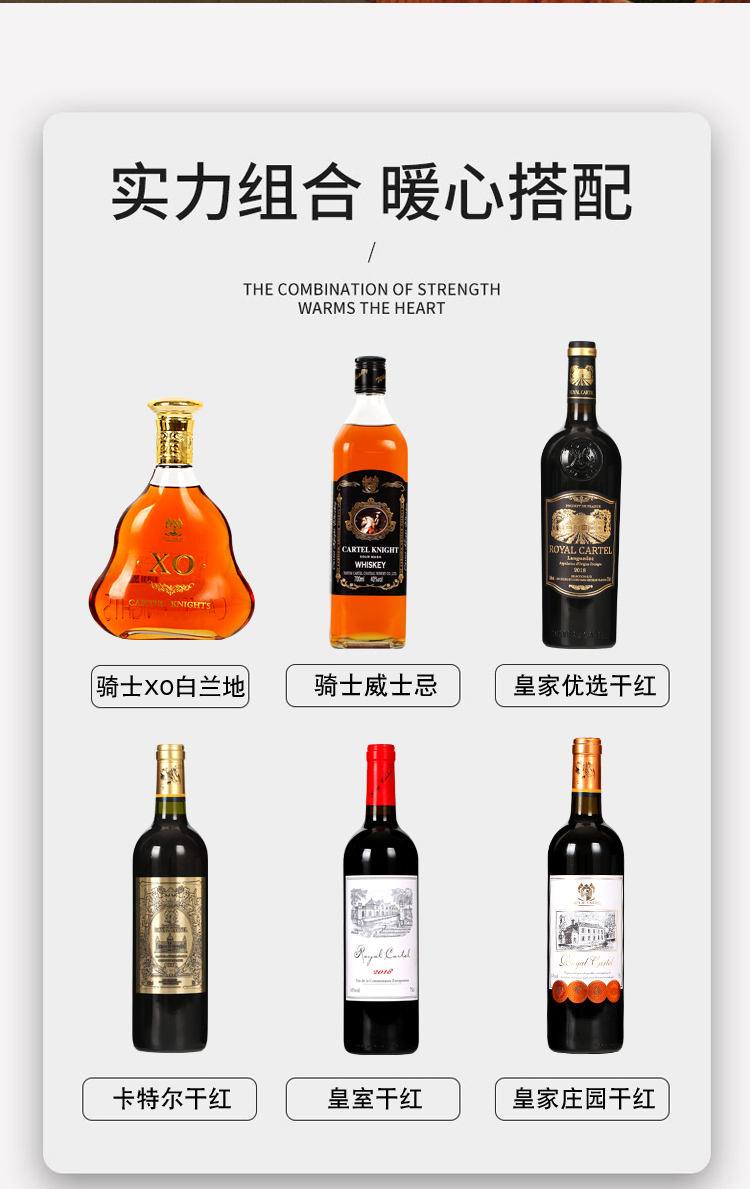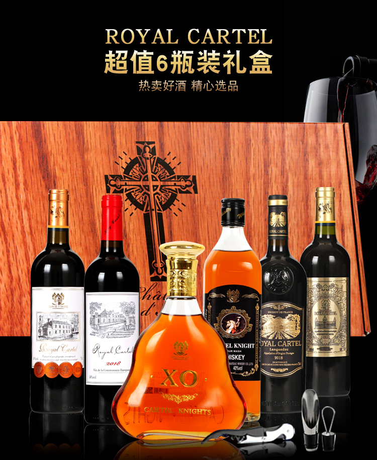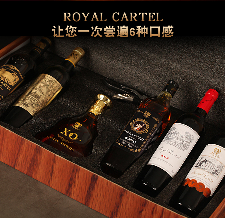 卡特尔进口红酒干红葡萄酒和洋酒威士忌XO共6支组合精美礼盒【红酒洋酒组合大礼包】