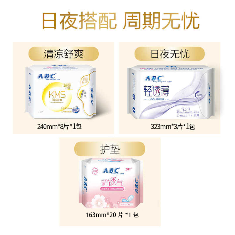 ABC日用夜用卫生巾组合装(日用240mm*24片+夜用323mm*6片+护垫163mm*20片)