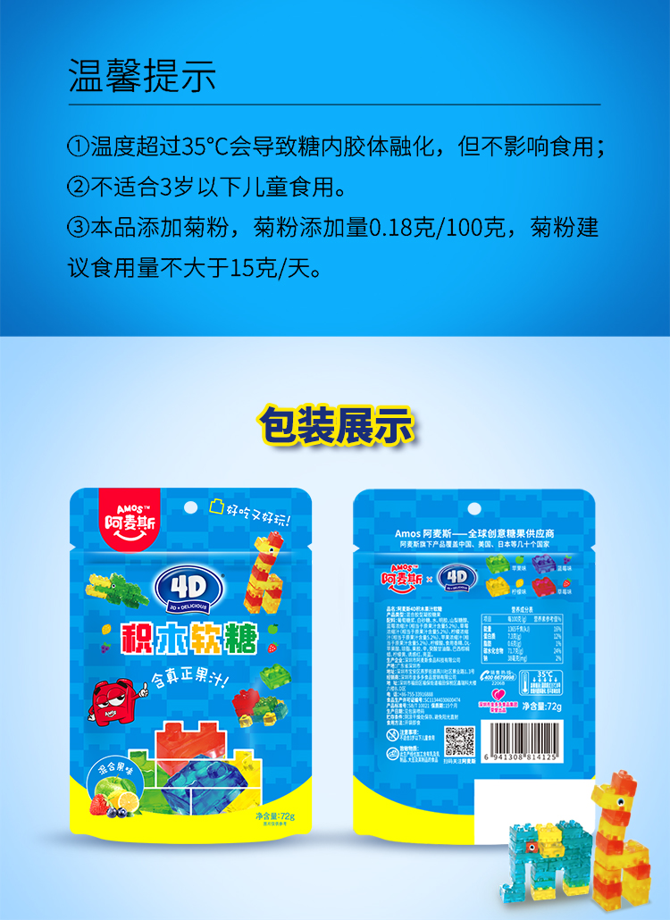 商品名称:AMOS/阿麦斯4D积木果汁软糖72g*5袋