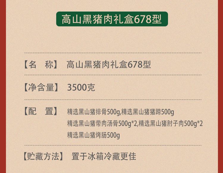 商品名称:25年贝师傅高山黑猪肉礼盒678型 3500g