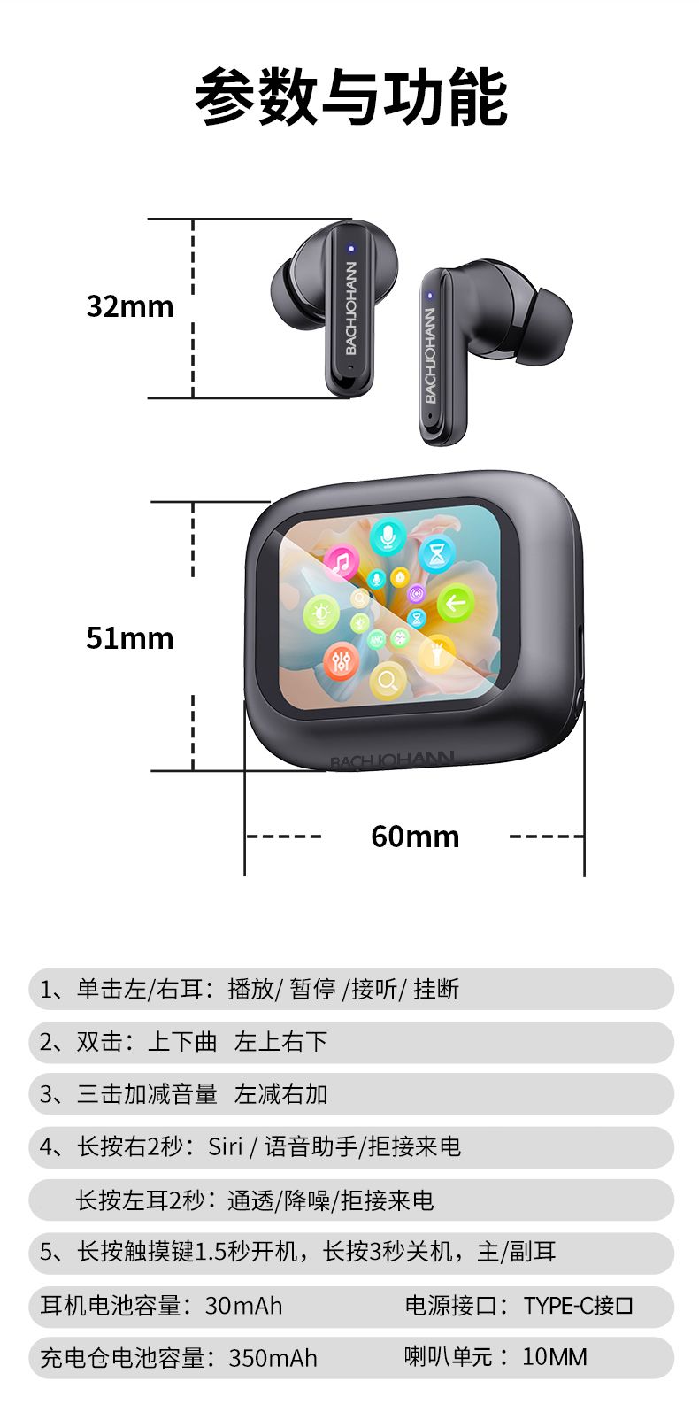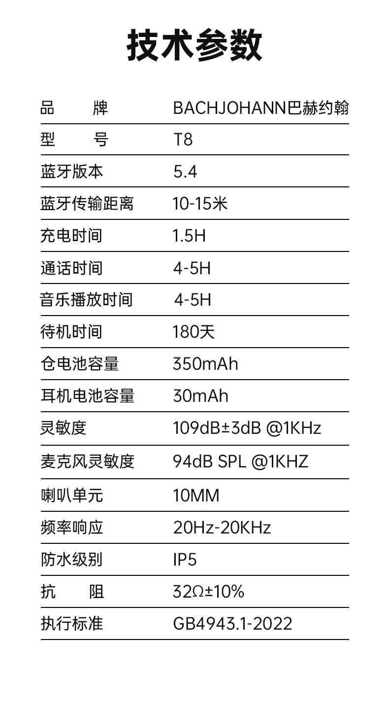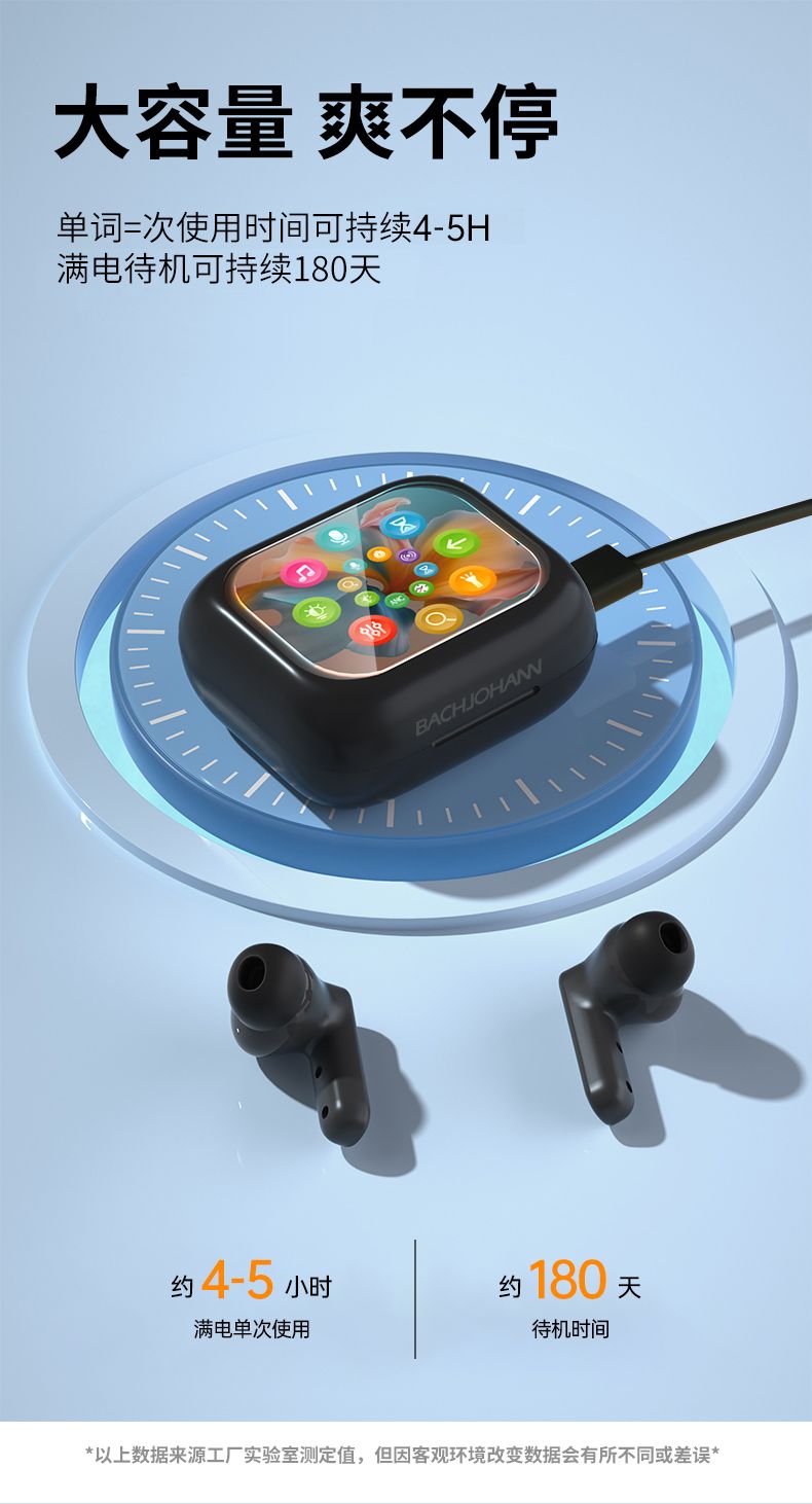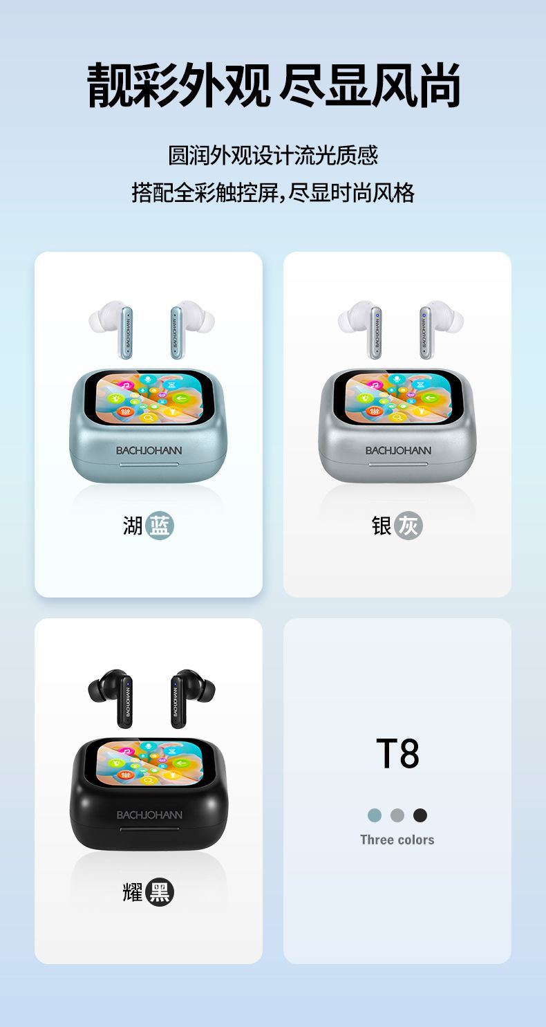 商品名称:bach johann 巴赫约翰T8无线蓝牙耳机主动降噪多功能彩屏TWS跑步运动入耳式商务休闲防水防汗手机平板通用