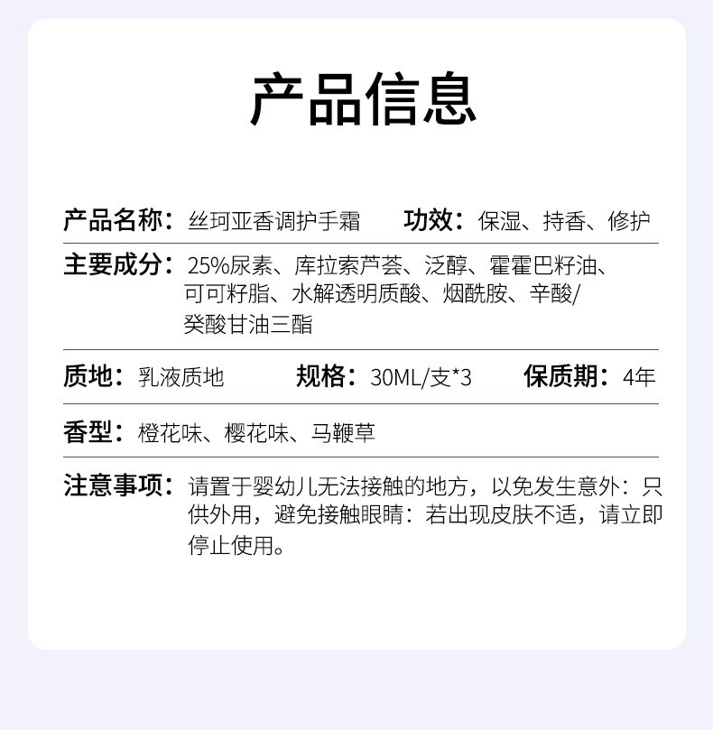 商品名称:Silkia/丝珂亚 芬芳护手霜套盒 (马鞭草+樱花+橙花)