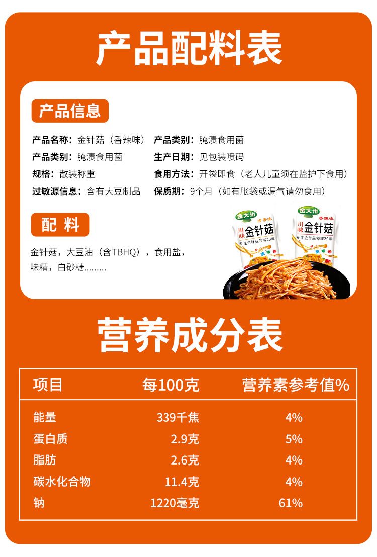 烧烤味金针菇20g*16包+泡椒笋尖88g*4包+香辣魔芋丝10g*50包