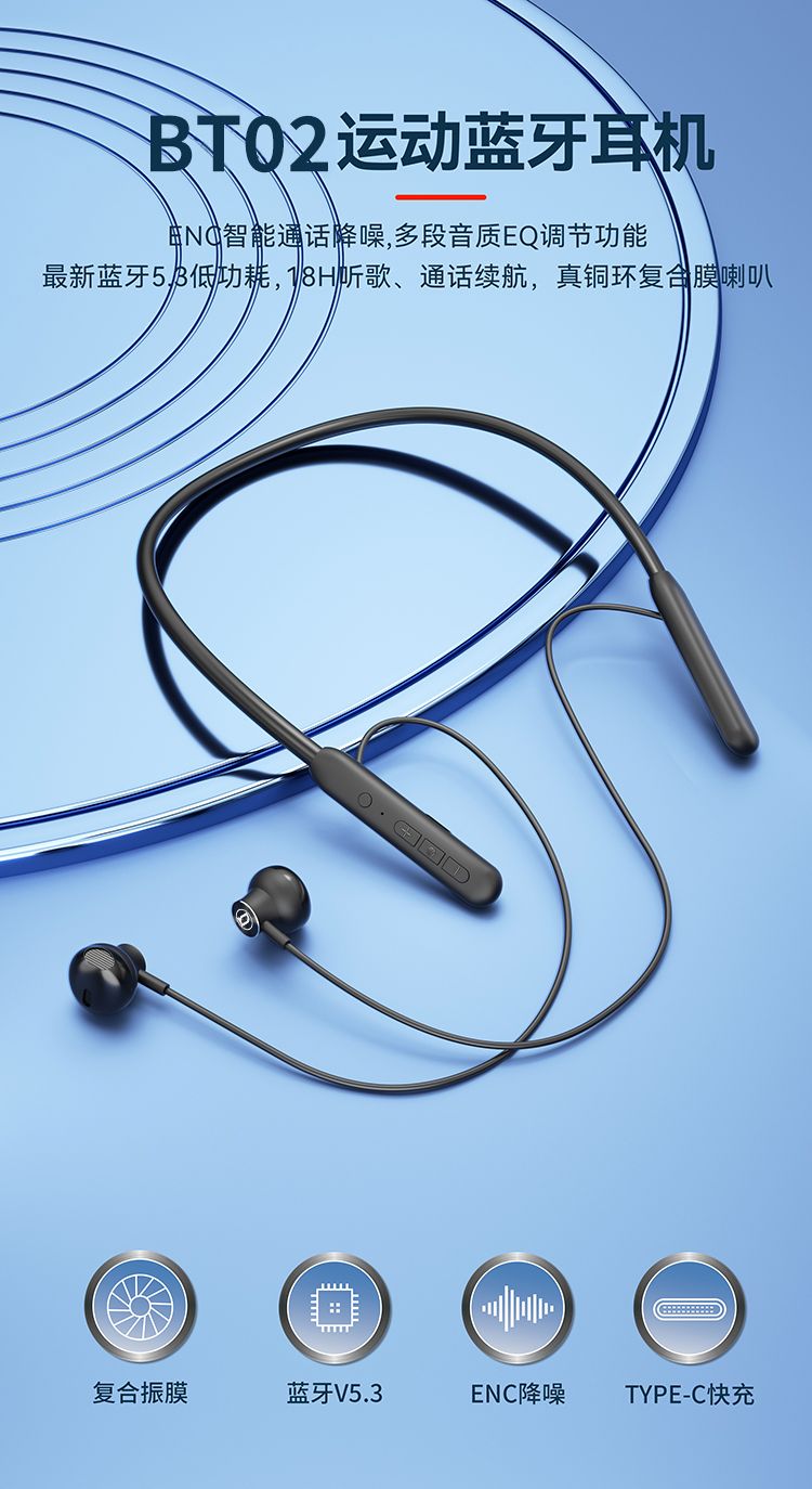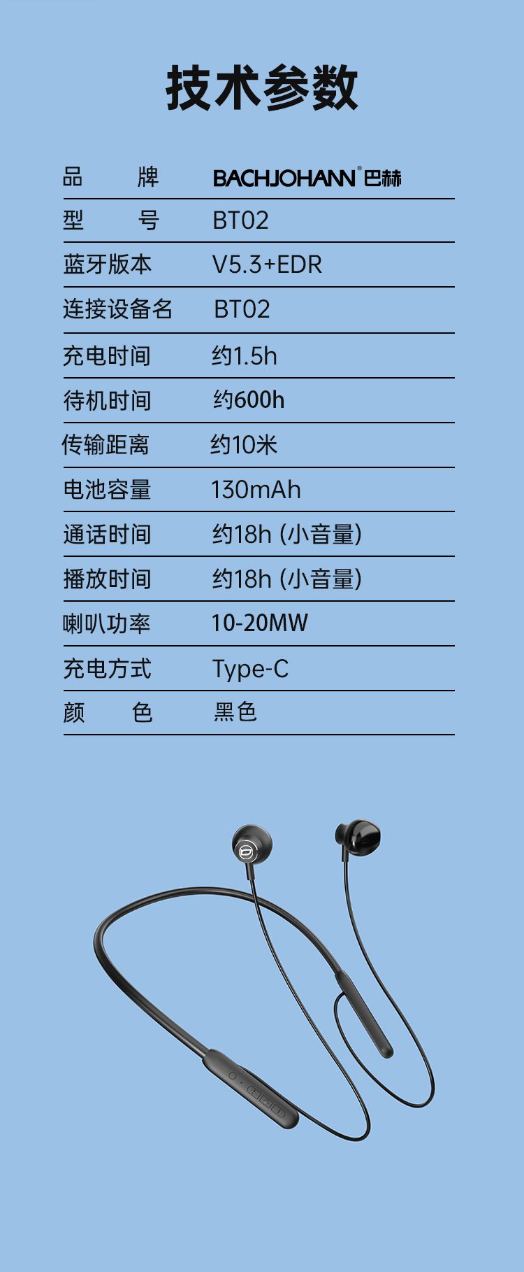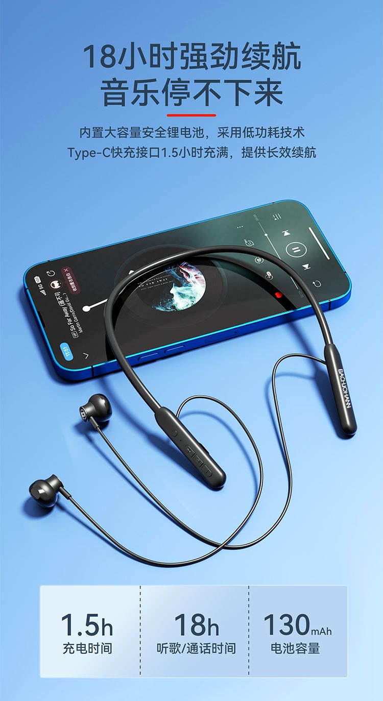 商品名称:bach johann 德国巴赫BT02无线蓝牙耳机颈挂脖式运动双耳跑步入耳超长待机耳塞降噪 绅士黑
