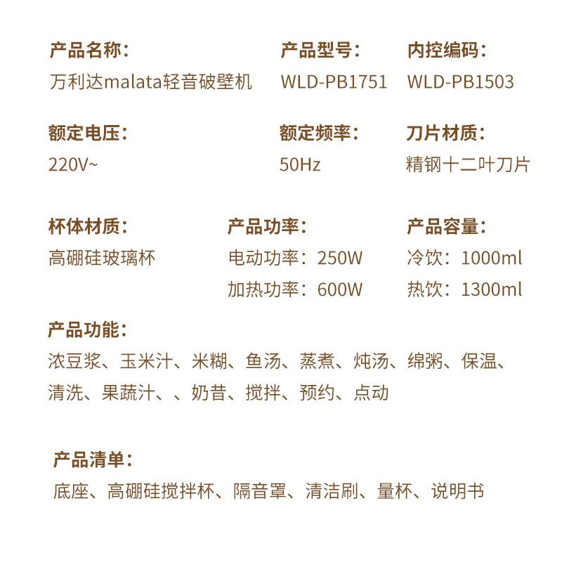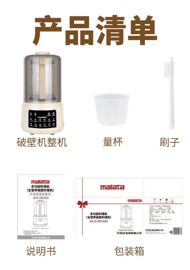 商品名称:Malata万利达超大容量轻音加热破壁机WLD-PB1503