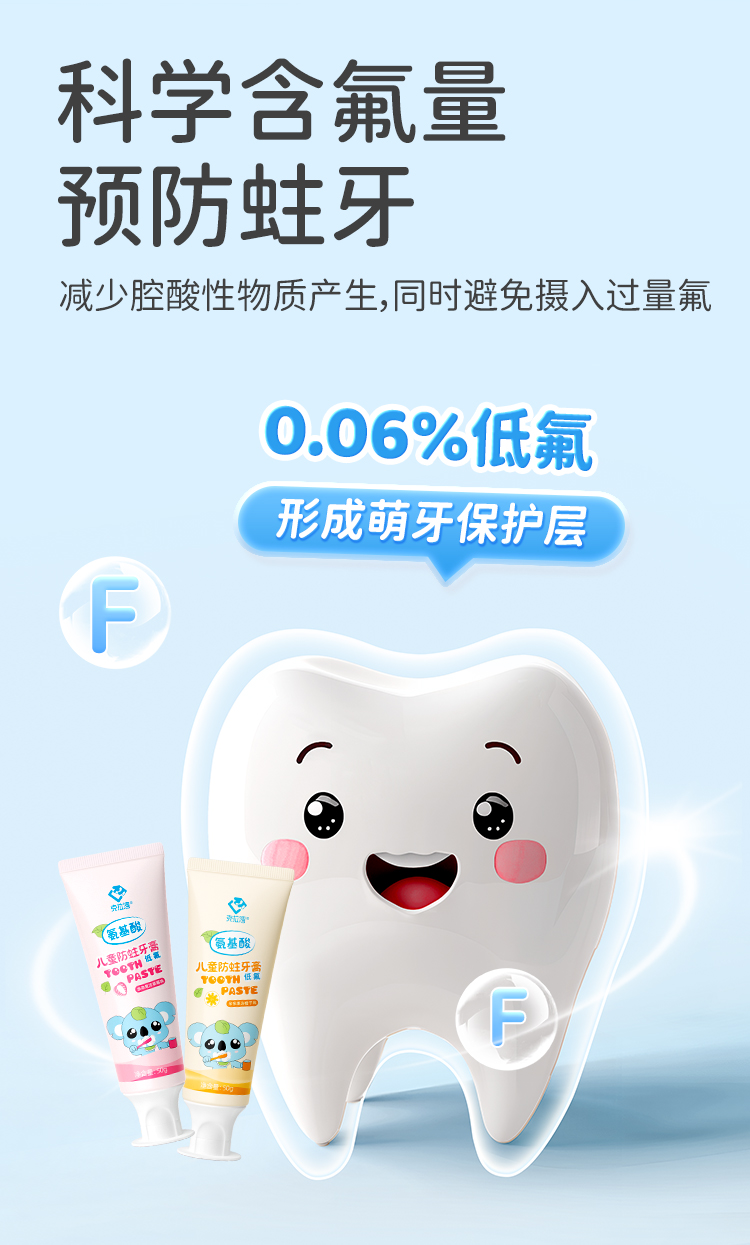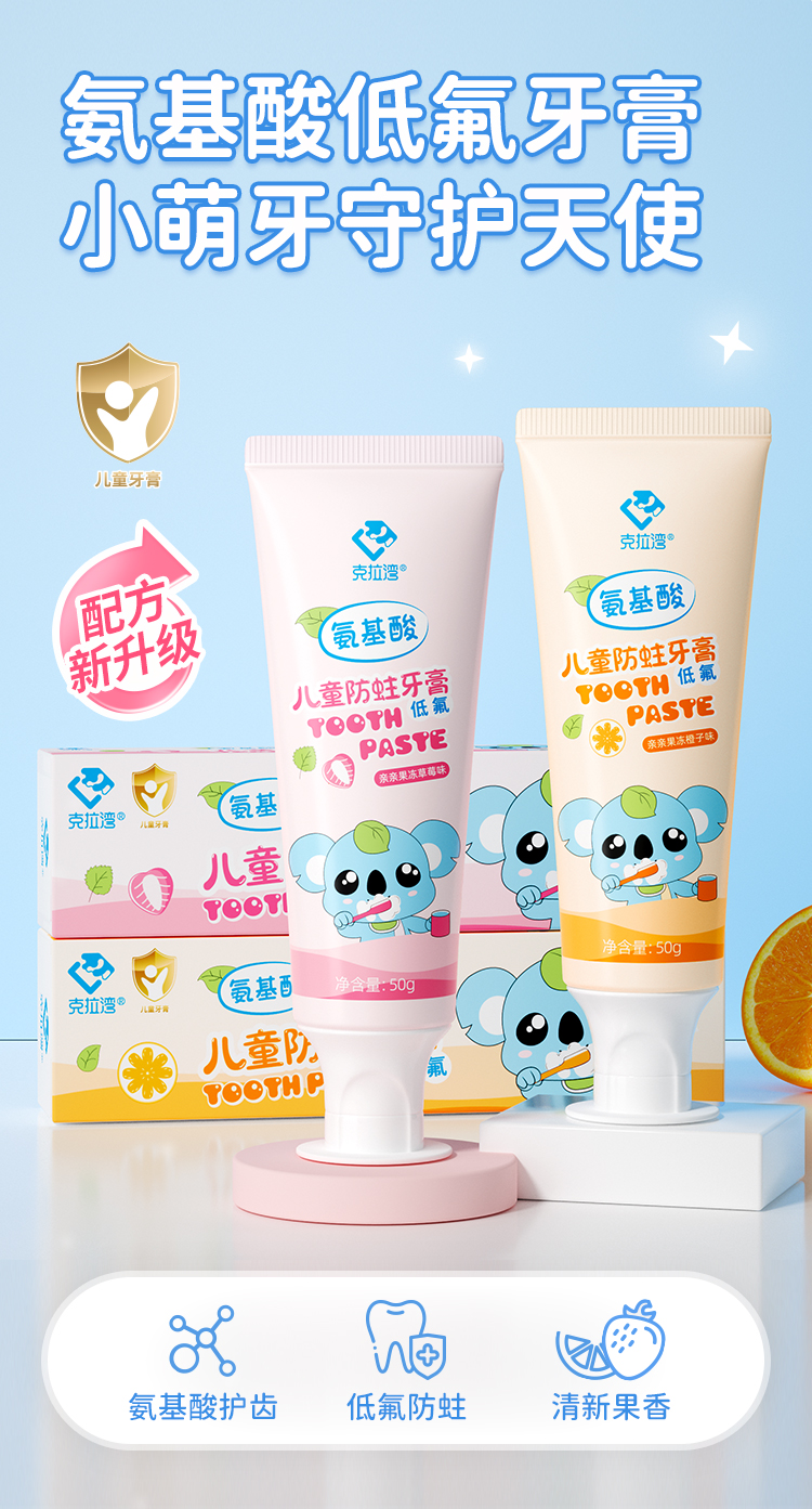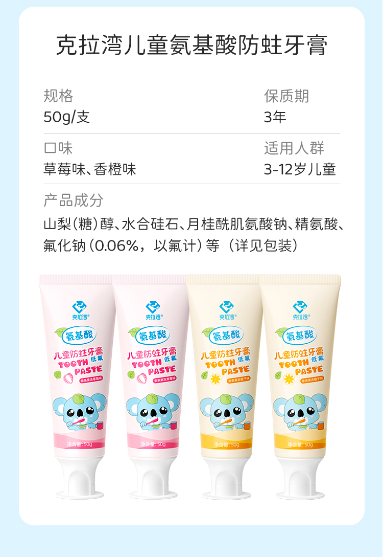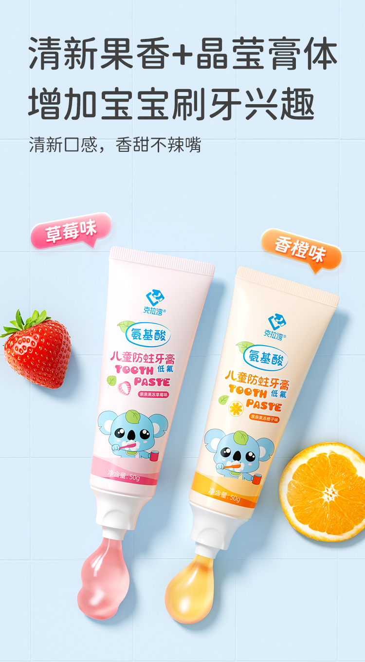 商品名称:克拉湾儿童防蛀牙膏50g氨基酸果味牙膏宝宝含低氟防蛀牙膏草莓味香橙味可选