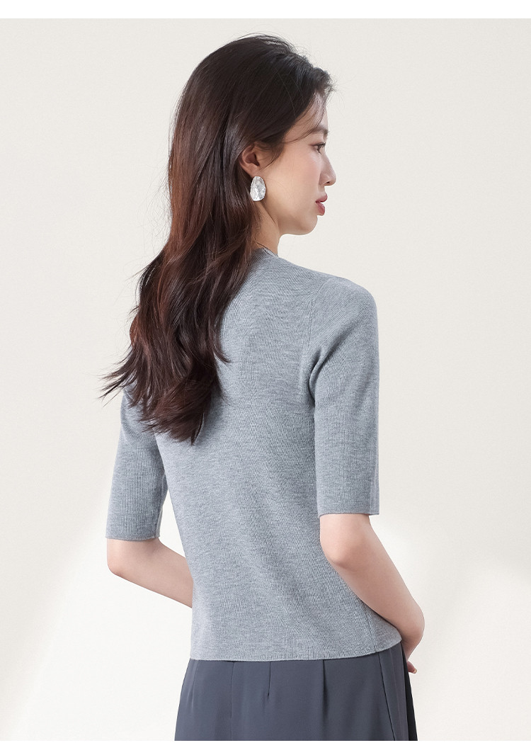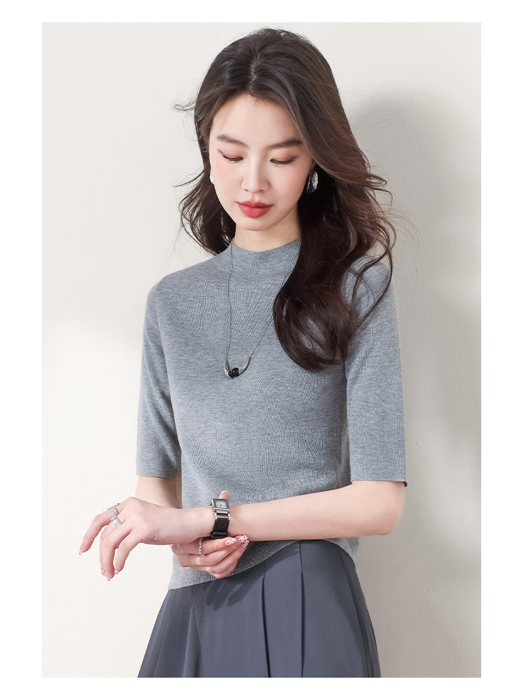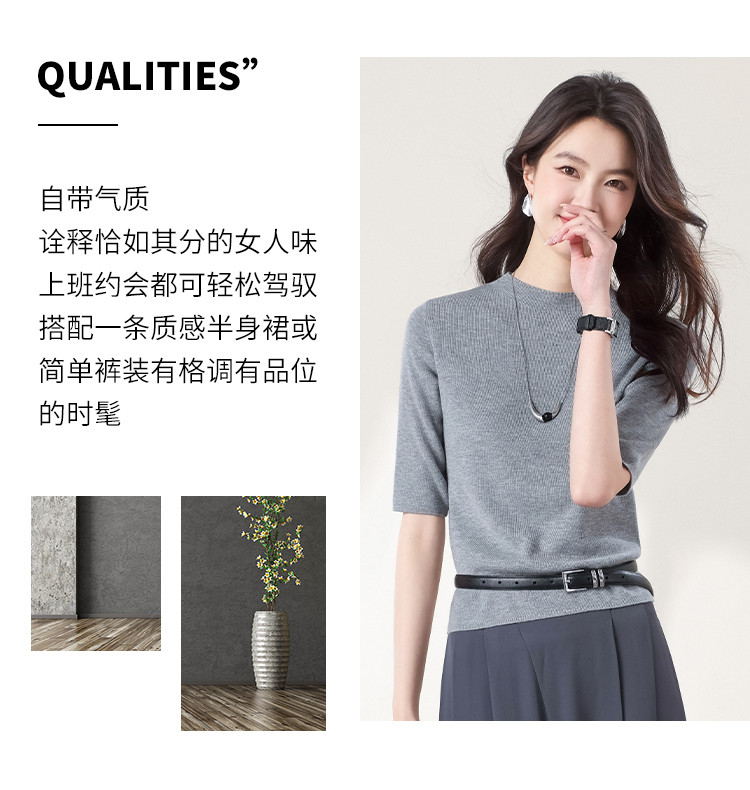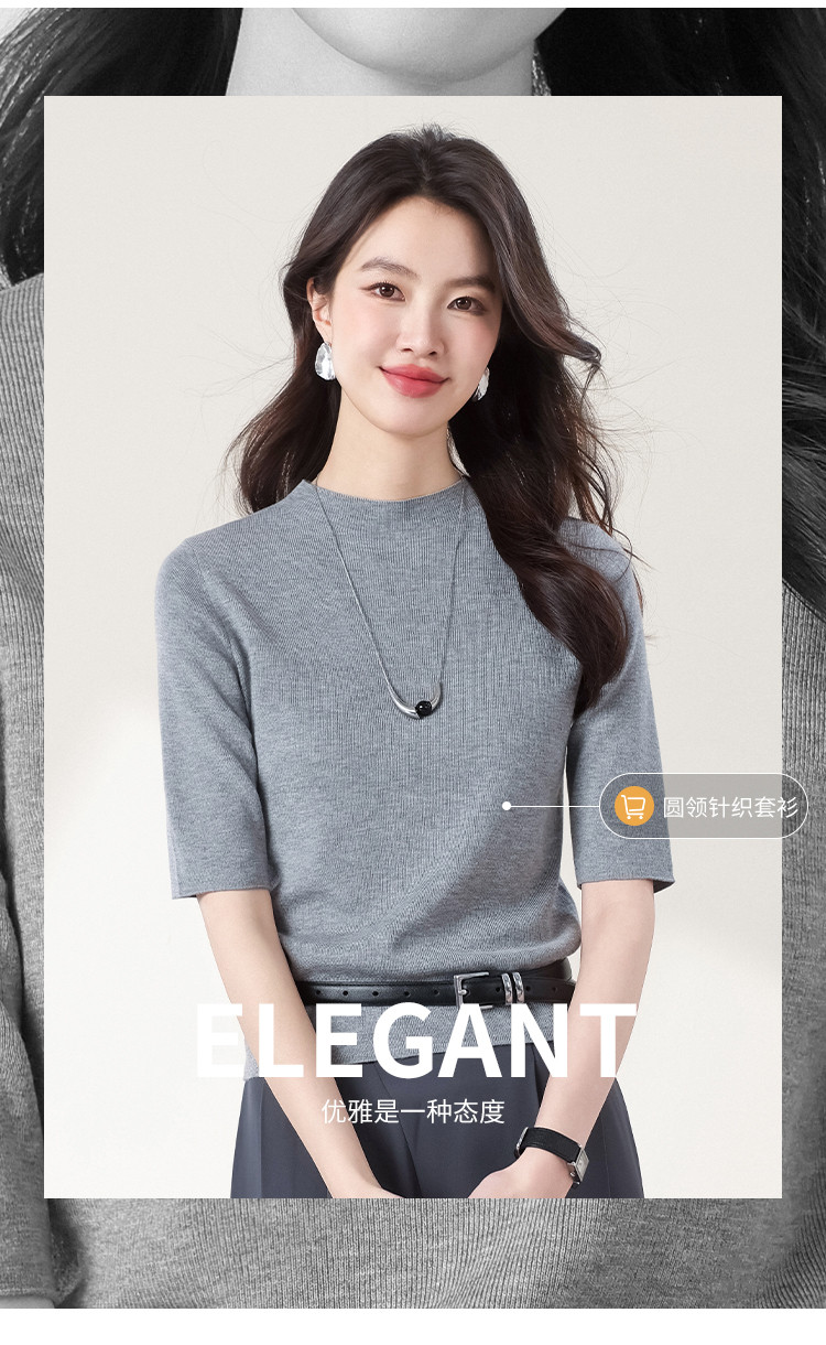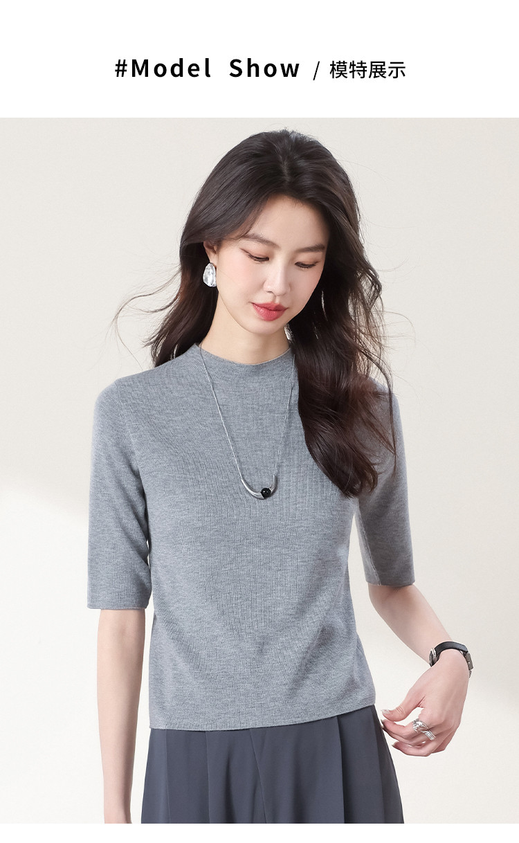 商品名称:含羊毛~圆领纯色针织衫女套头百搭休闲五分袖打底衫春夏简约T恤 116691