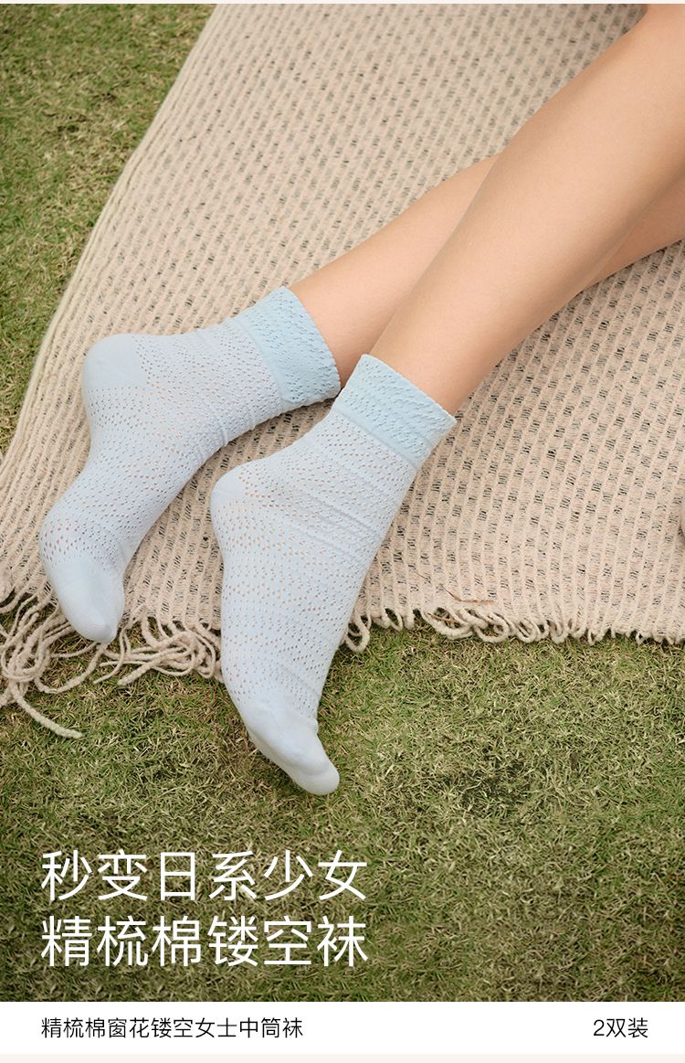 【5A抗菌】25新款精梳棉镂空女士中筒袜夏季薄款2双装 041600