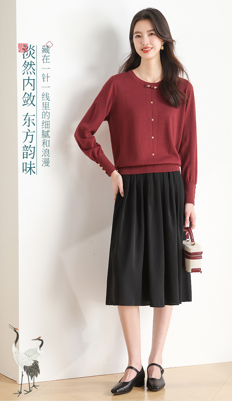 【新中式】圆领钉珠国风针织衫女套头纯色含桑蚕丝春装上衣 325139