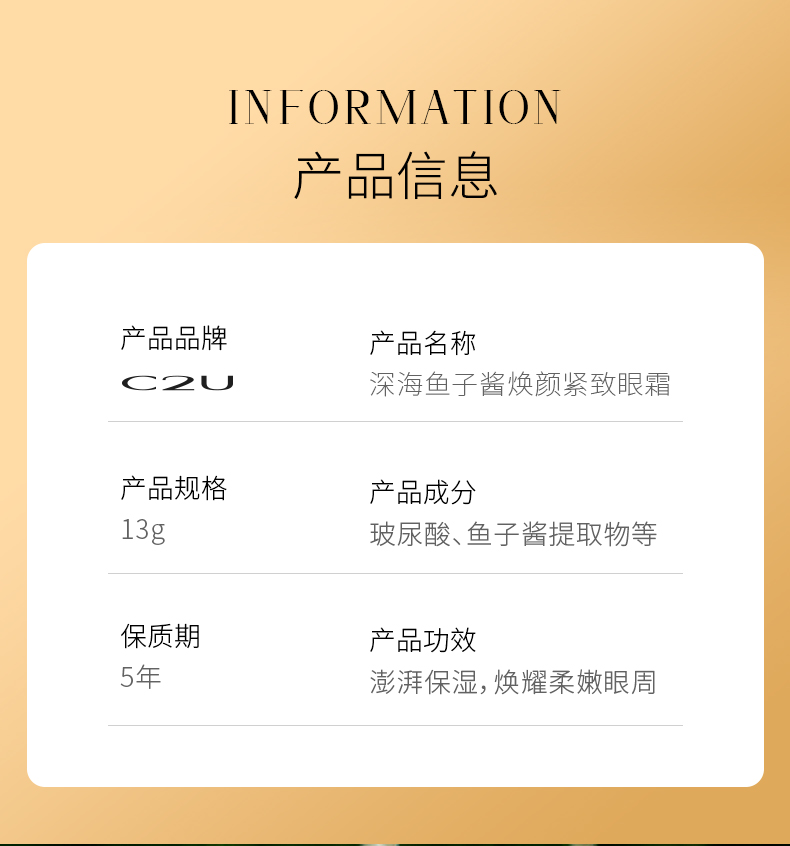 商品名称:【包邮】C2U深海鱼子酱焕颜紧致眼霜保湿滋润眼部肌肤鱼尾纹海藻贵妇眼霜13g