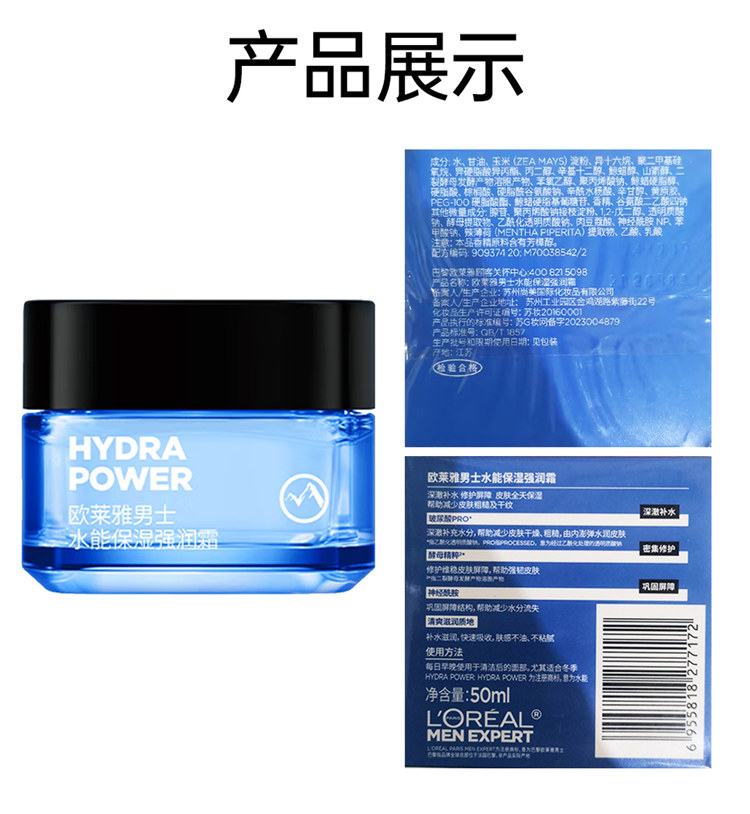 商品名称:L'OREAL/欧莱雅男士水能保湿强润霜50ml 新旧包装随机不接受指定
