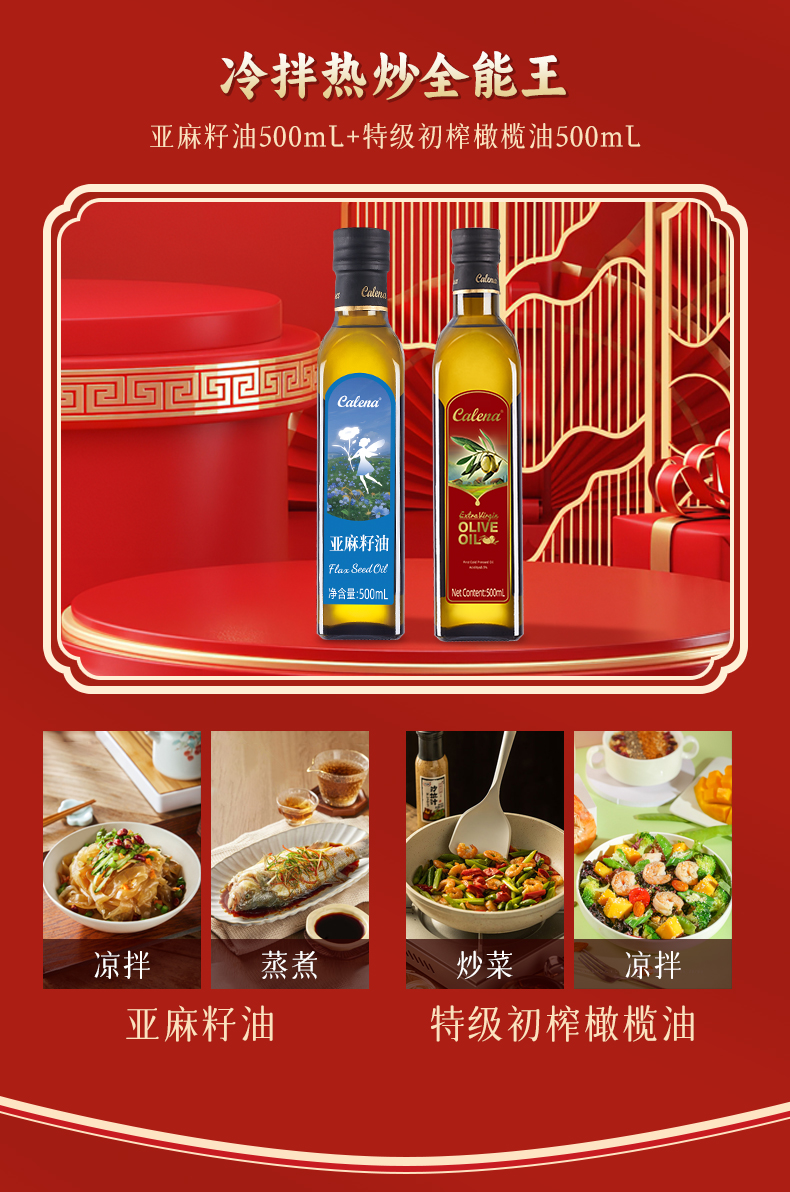 商品名称:Calena/克莉娜亚麻籽油500ml+特级初榨橄榄油500ml