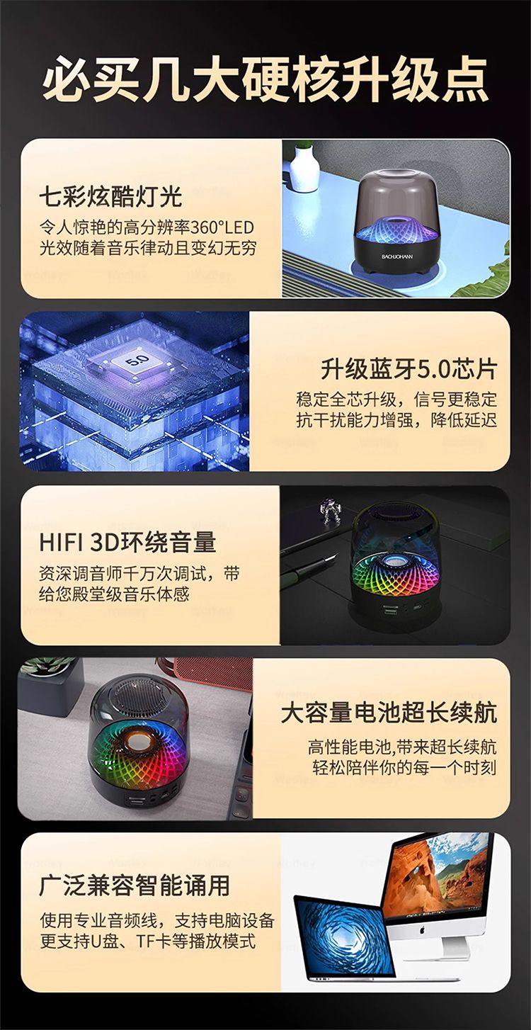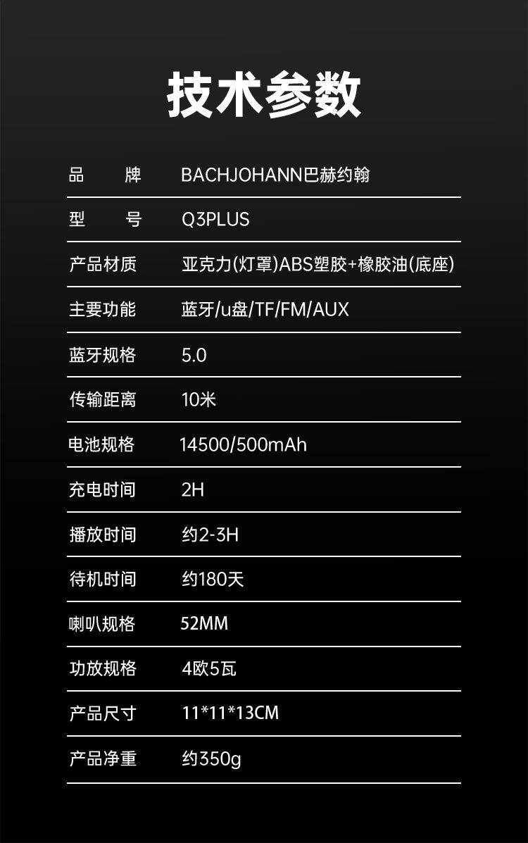 商品名称:bach johann巴赫约翰 Q3PLUS无线蓝牙音箱HIFI高保真音效重低音炮音响户外便携手持七彩灯插卡