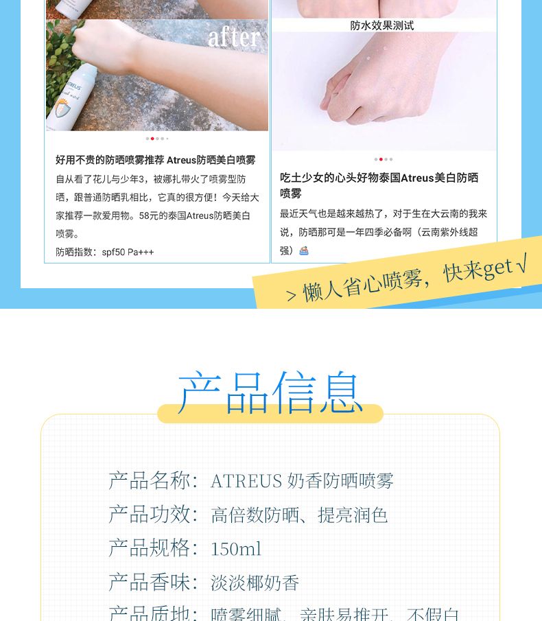 商品名称:ATREUS 牛奶防晒喷雾 SPF50 150ML