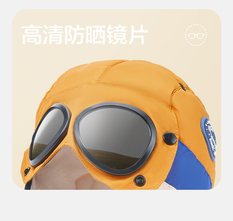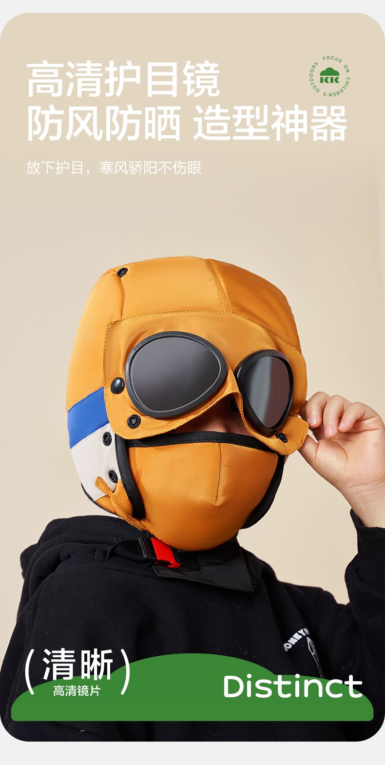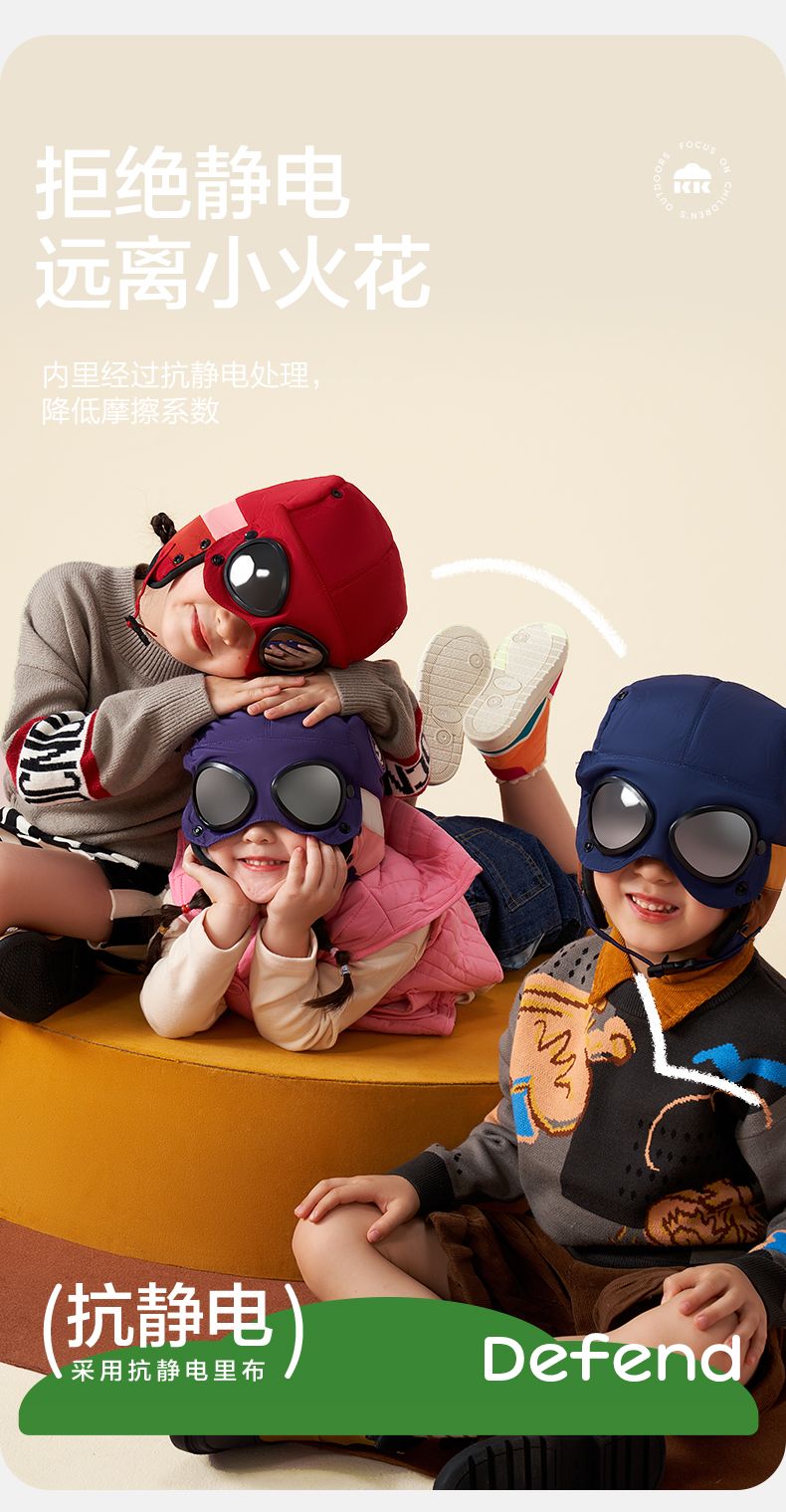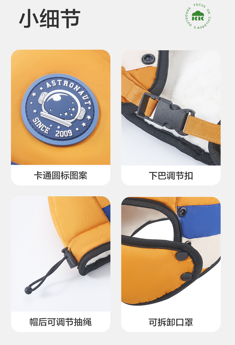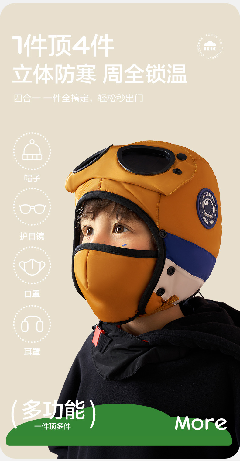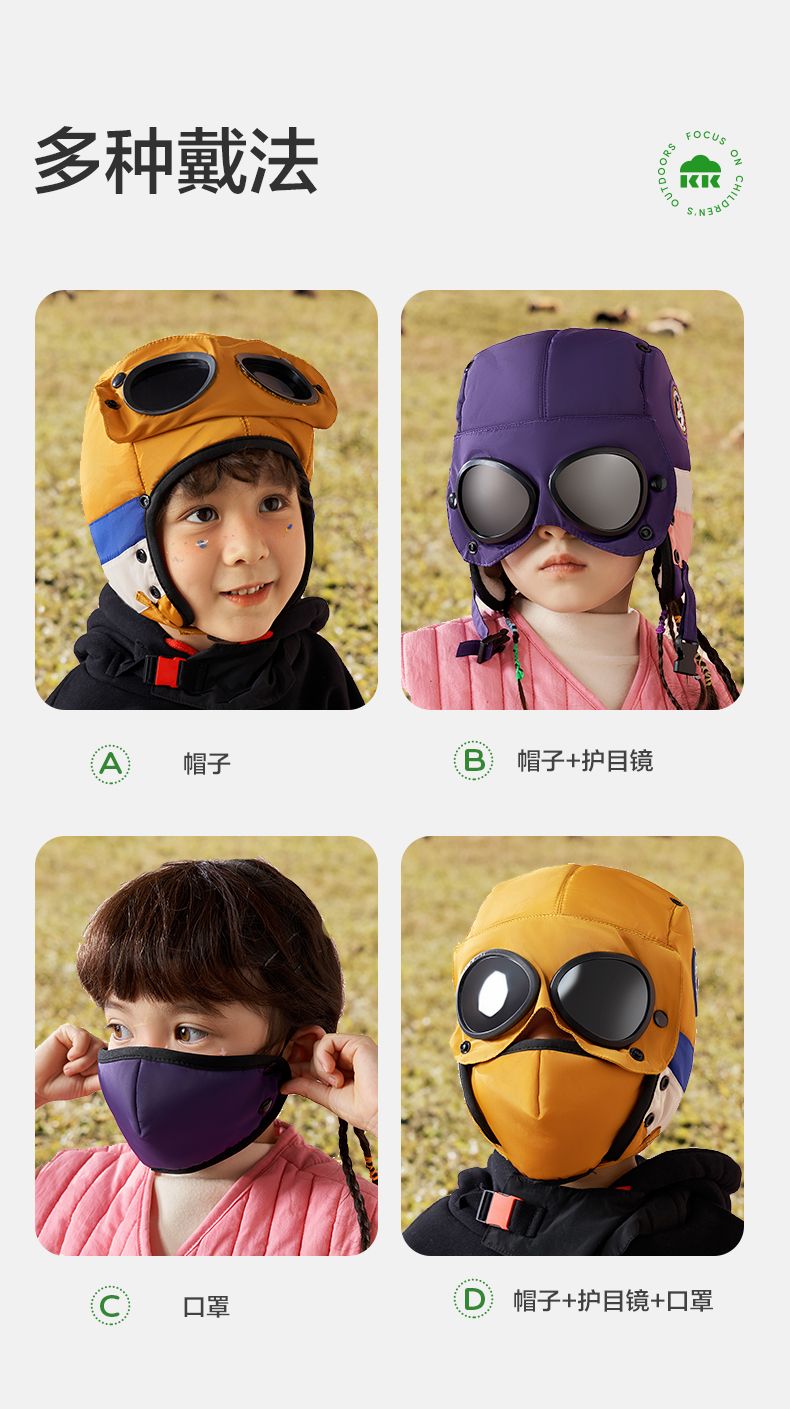 商品名称:【直供】KK树飞行员儿童雷锋帽防风护耳帽秋冬季加绒帽子圆标撞色眼镜口罩帽
