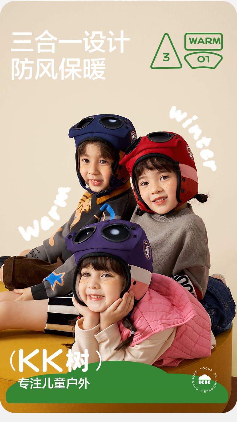 【直供】KK树飞行员儿童雷锋帽防风护耳帽秋冬季加绒帽子圆标撞色眼镜口罩帽