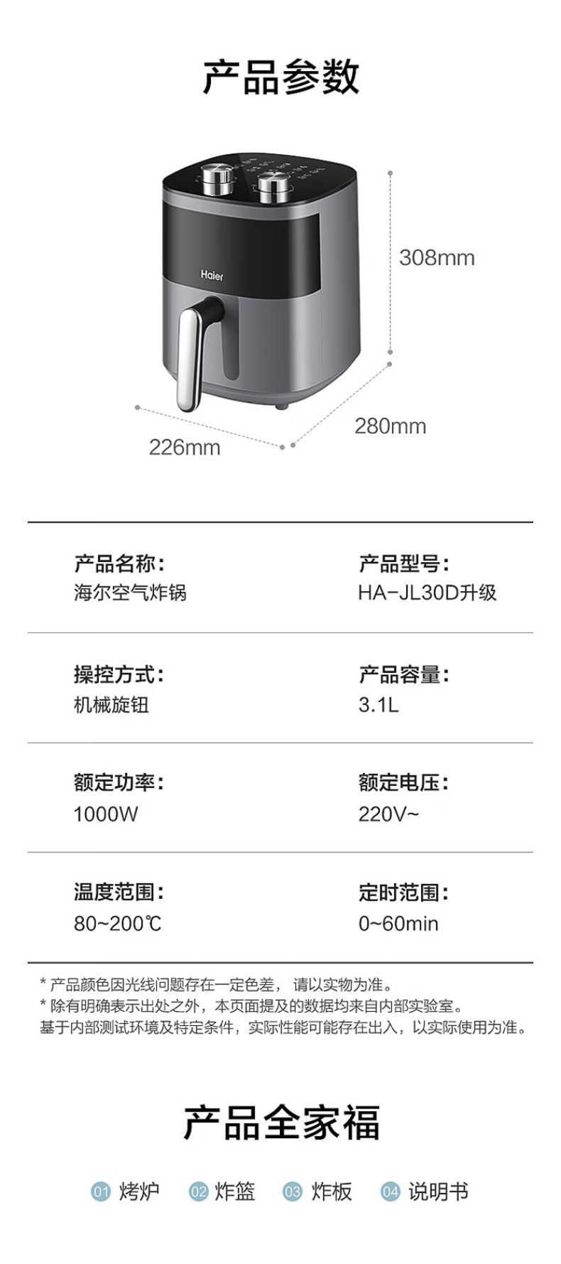商品名称:海尔(Haier)空气炸锅 大容量家用HA-JL30D升级