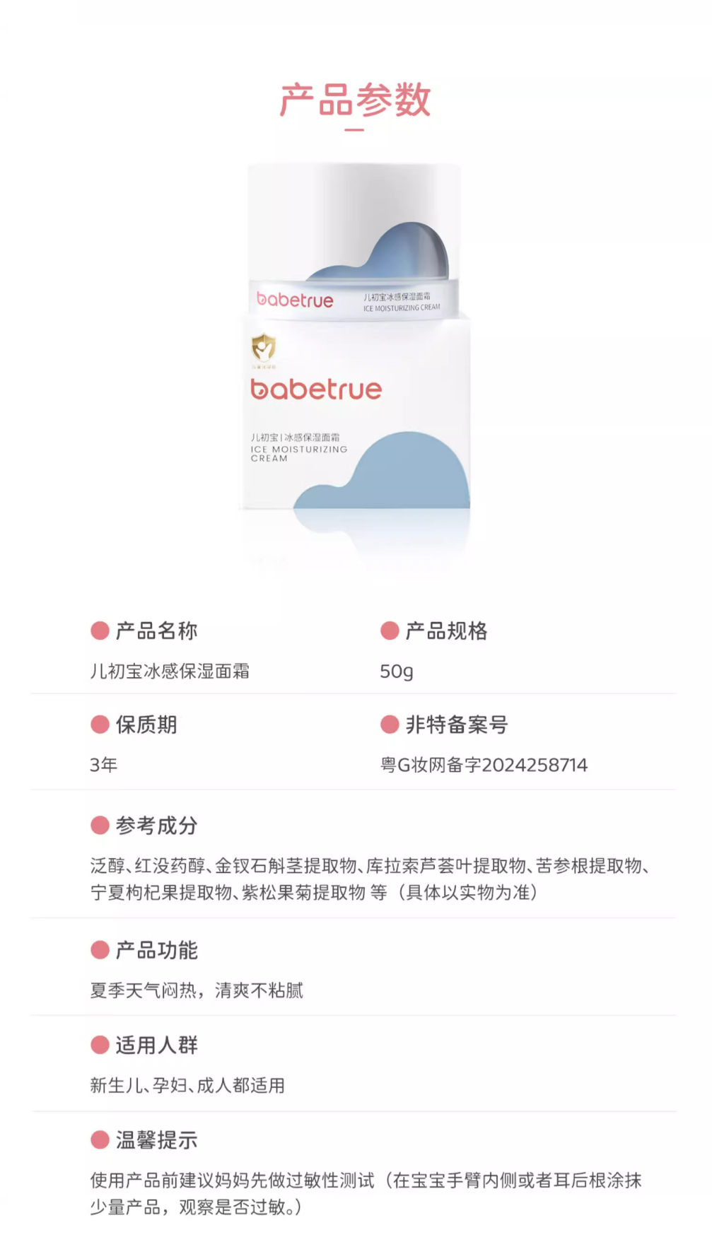 商品名称:BABETRUE儿初宝 婴幼儿冰感舒缓保湿面霜(50g)