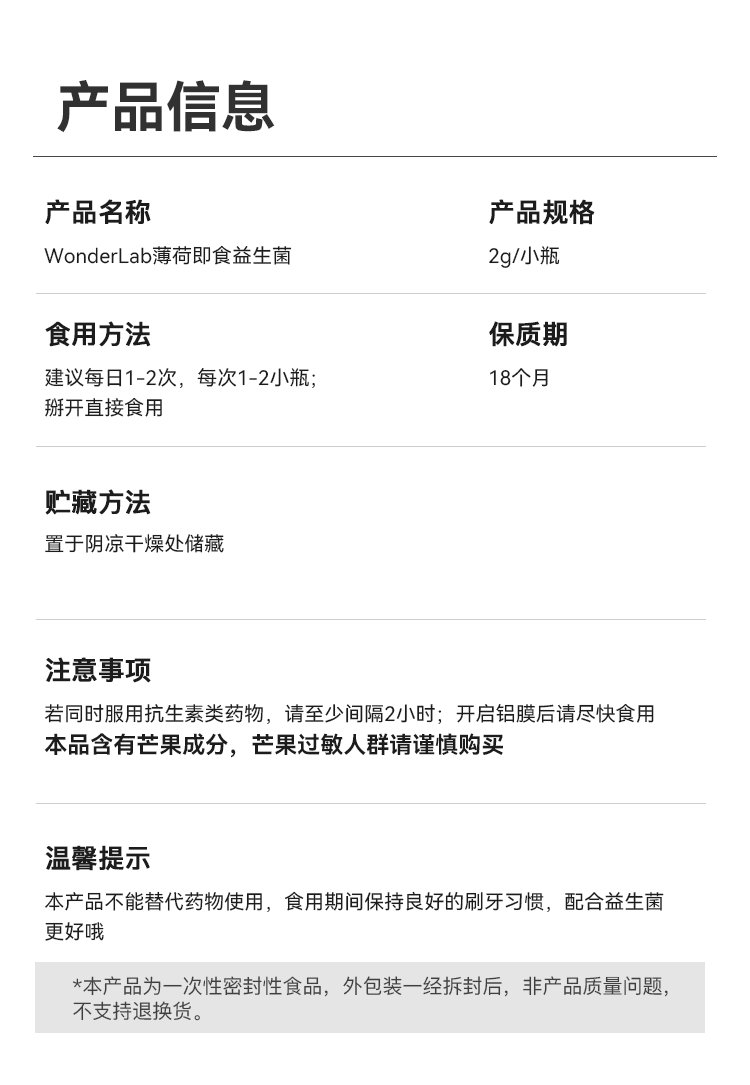 商品名称:WonderLab/万益蓝 薄荷益生菌即食乳酸菌 2g*30瓶