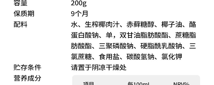 商品名称:椰子知道 0糖厚椰乳 200g*9瓶(咖啡伴侣)