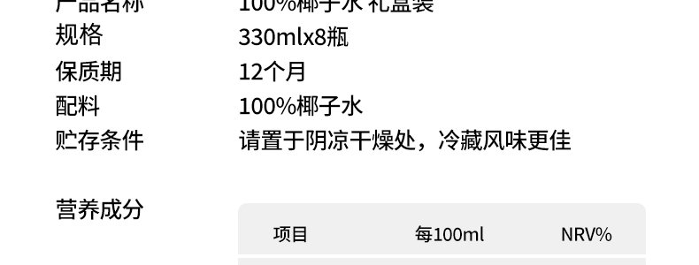 商品名称:椰子知道 100%NFC椰子水 330ml*8瓶