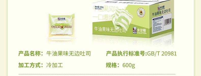 商品名称:卡尔顿(Calleton)牛油果味无边吐司 600g