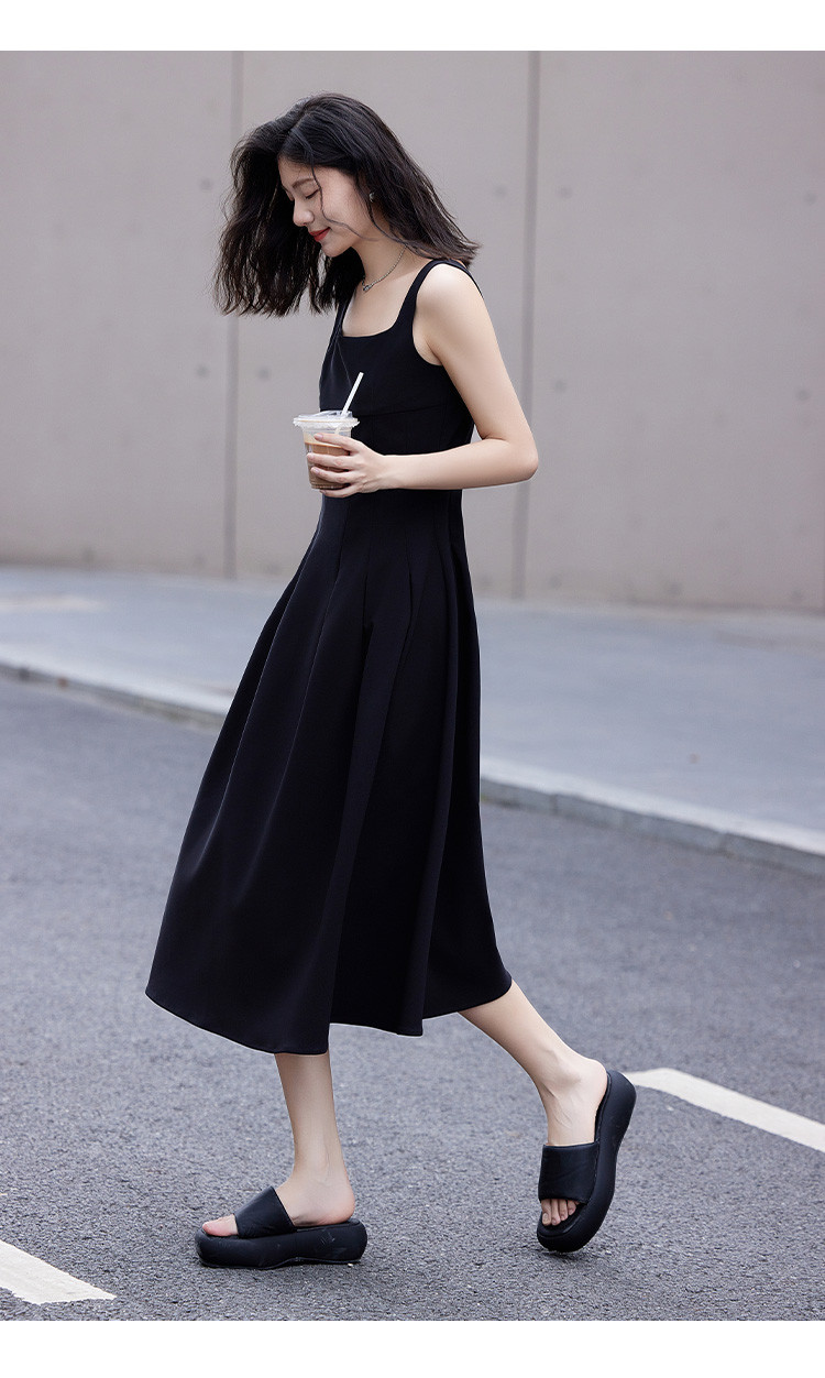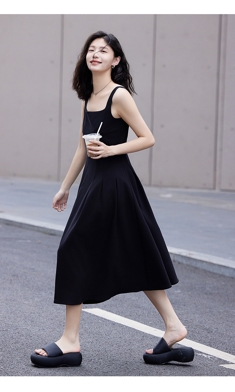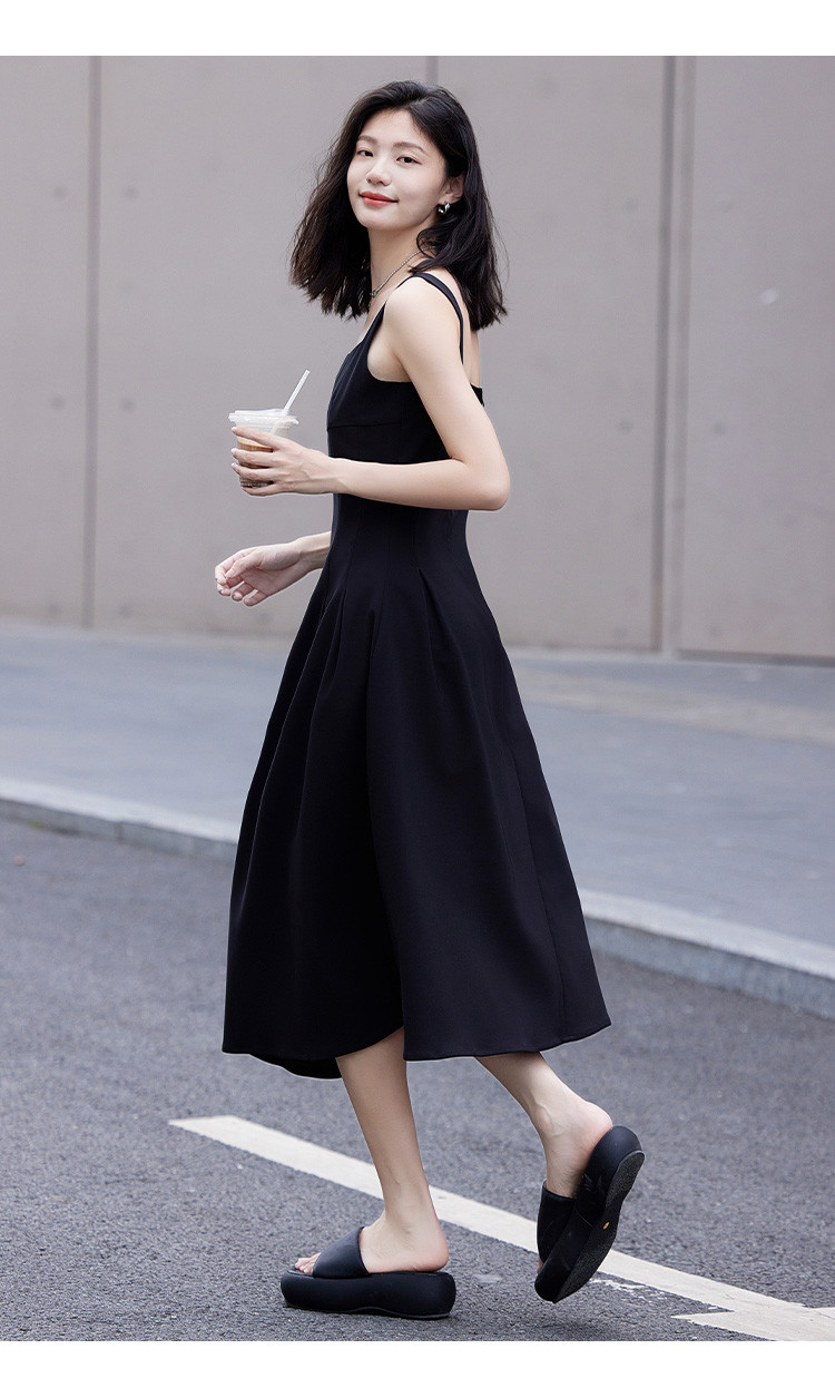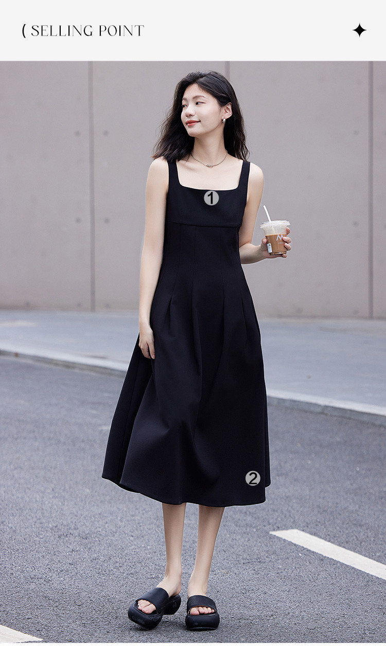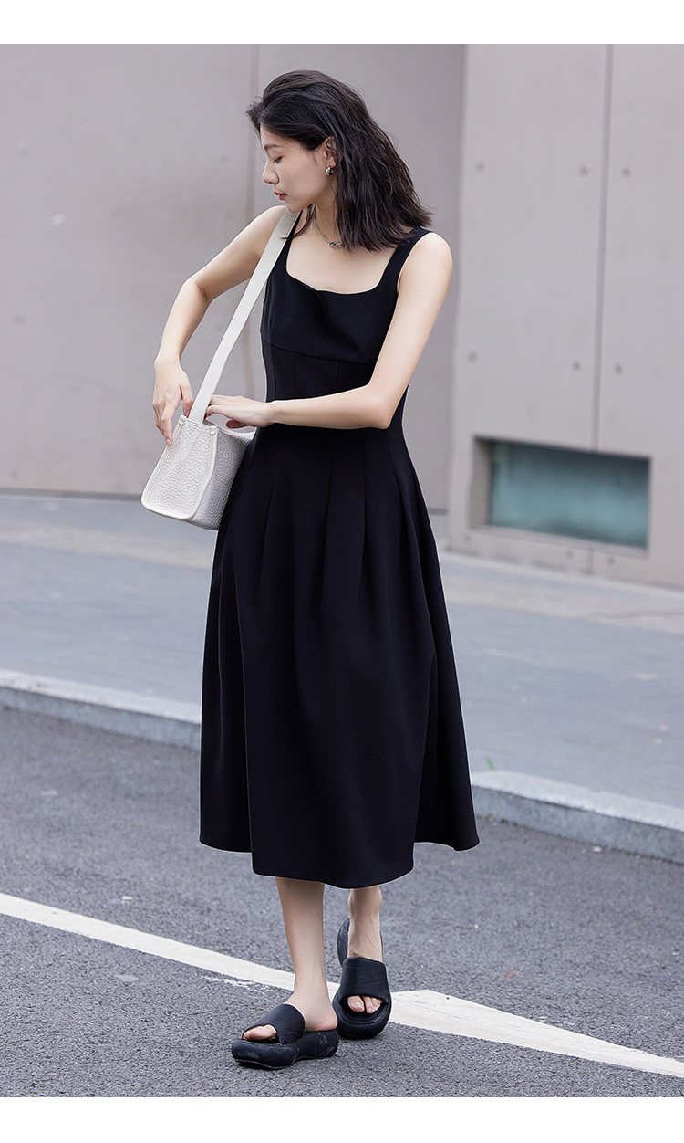 【法式小黑裙】秋款优雅微弹感捏褶造型方领吊带连衣裙女 843330
