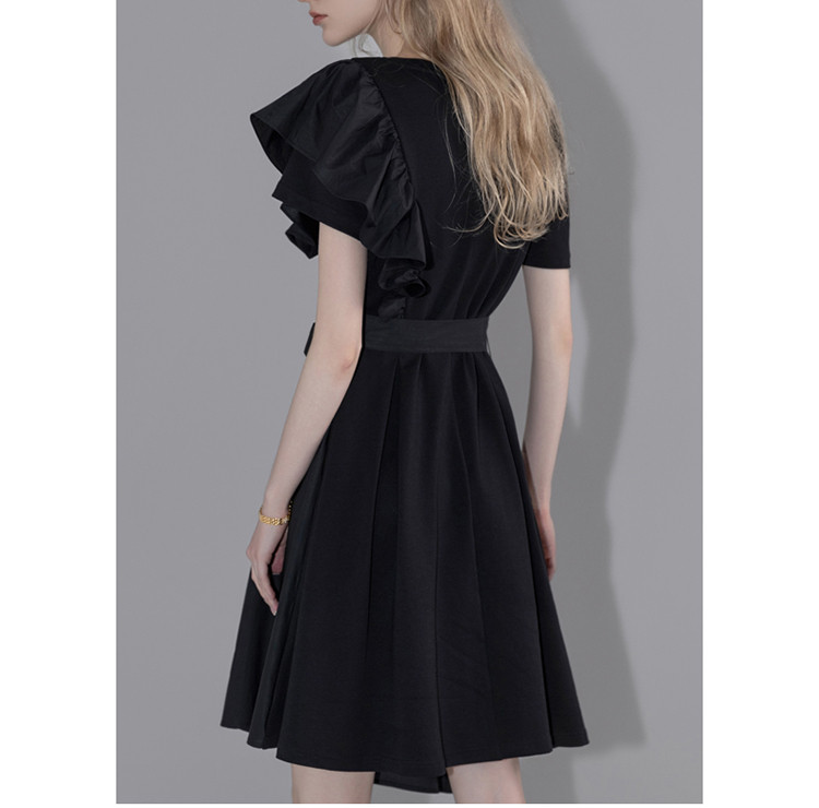 【针织不规则a字裙】夏圆领短袖荷叶边连衣裙 428225