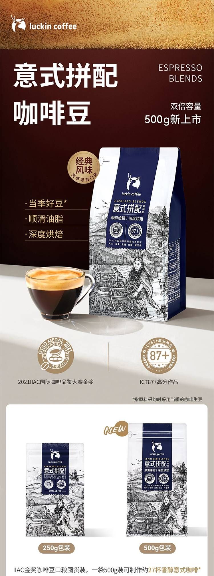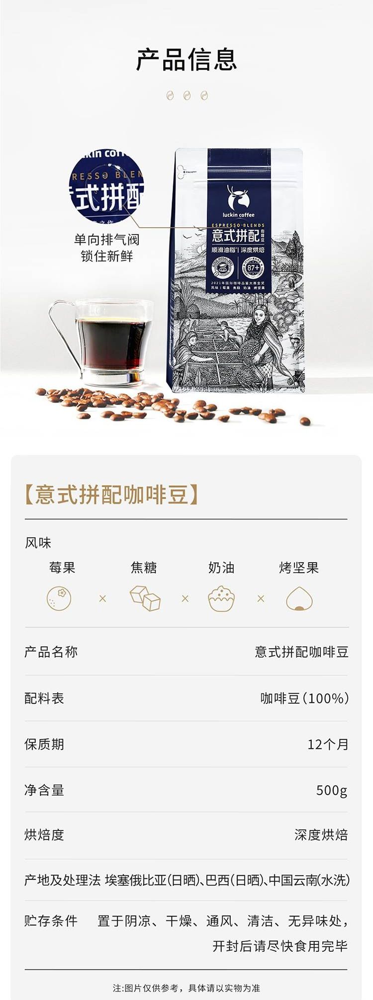 商品名称:瑞幸咖啡意式拼配阿拉比卡咖啡豆500g