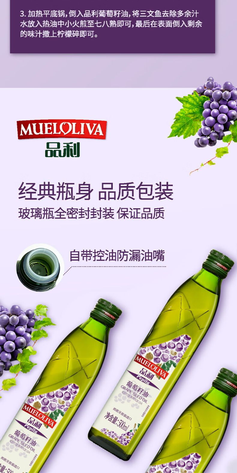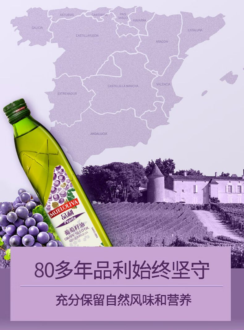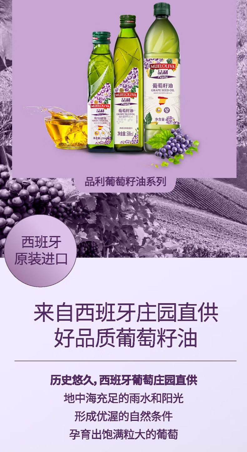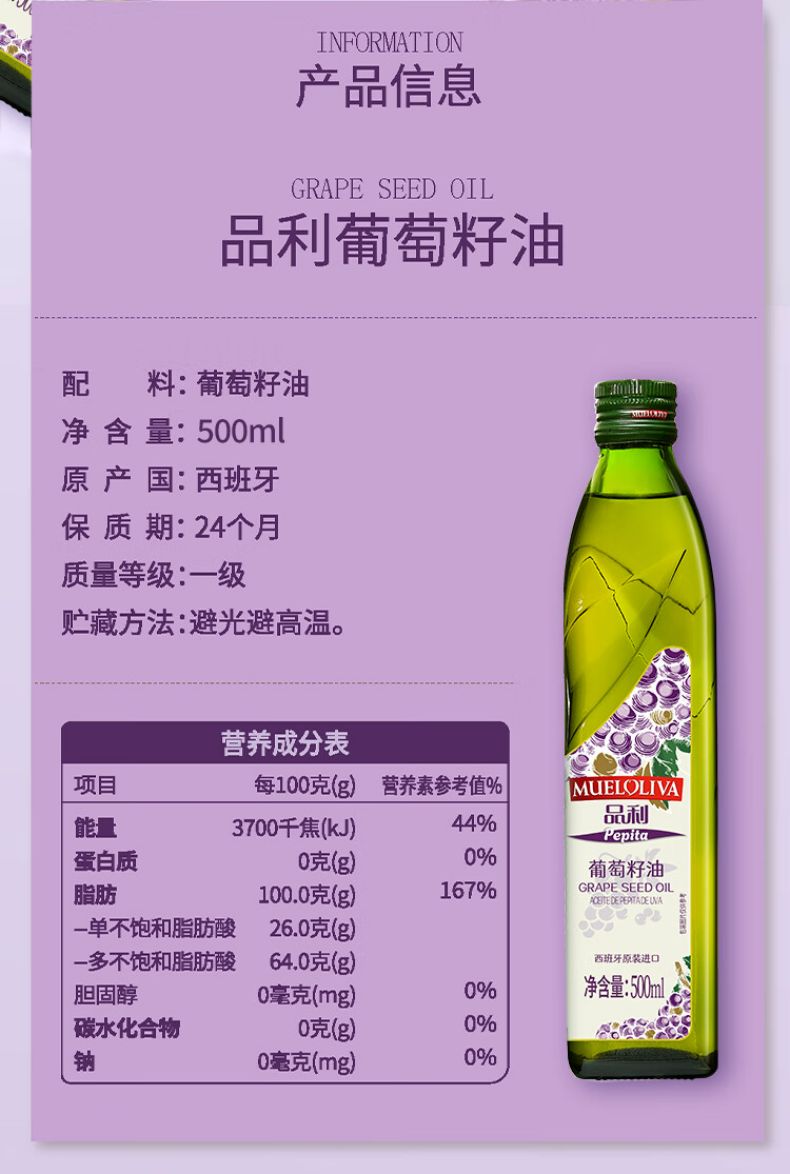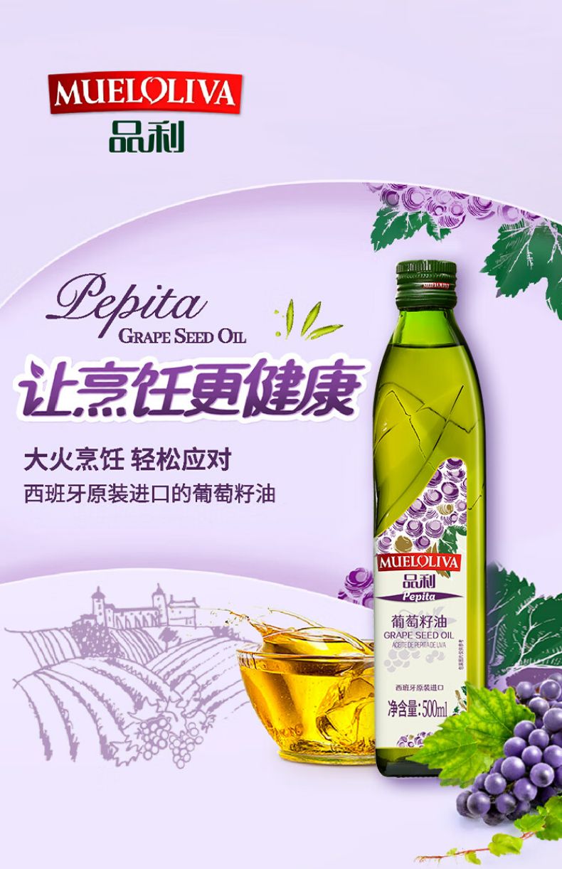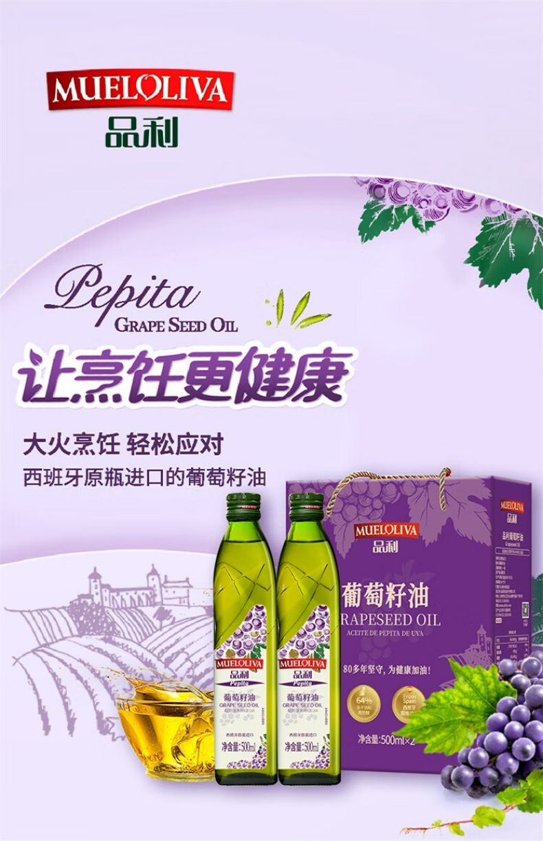 商品名称:品利葡萄籽油 500ml*2礼盒 西班牙原瓶进口 耐高温少油烟 食用油