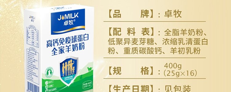 商品名称:卓牧(JOMILK)高钙免疫球蛋白羊奶粉 400g