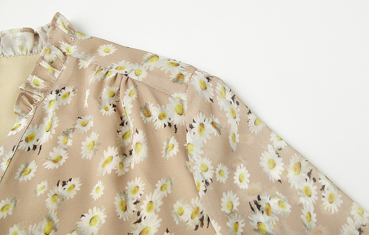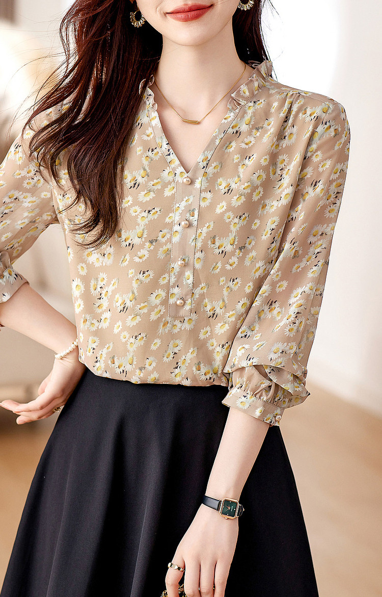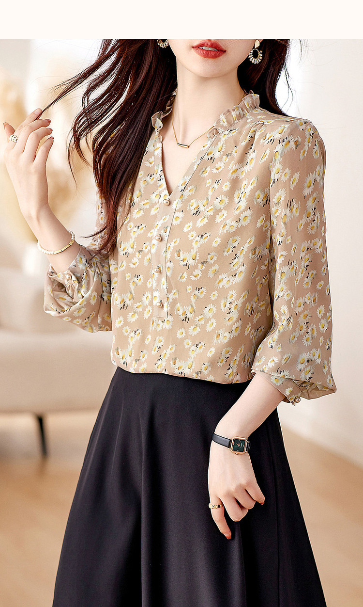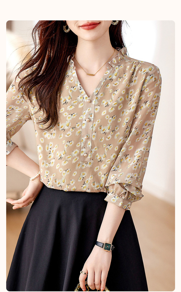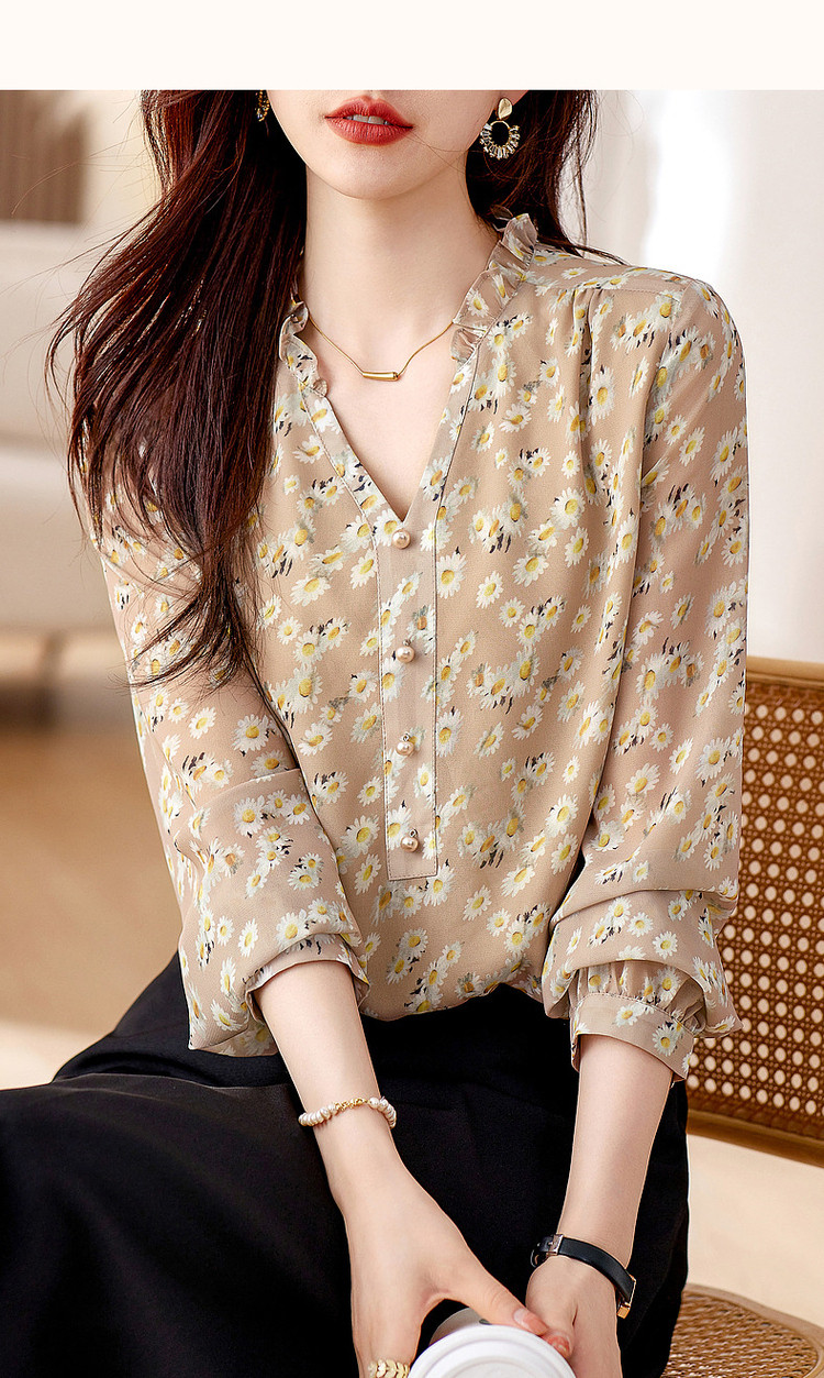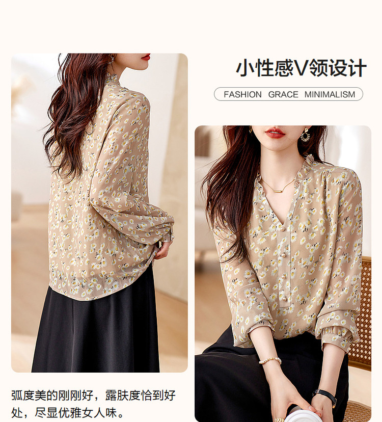 商品名称:【曼日花事】春秋轻熟优雅印花V领长袖衬衫气质遮肉衬衣女装上衣 106369