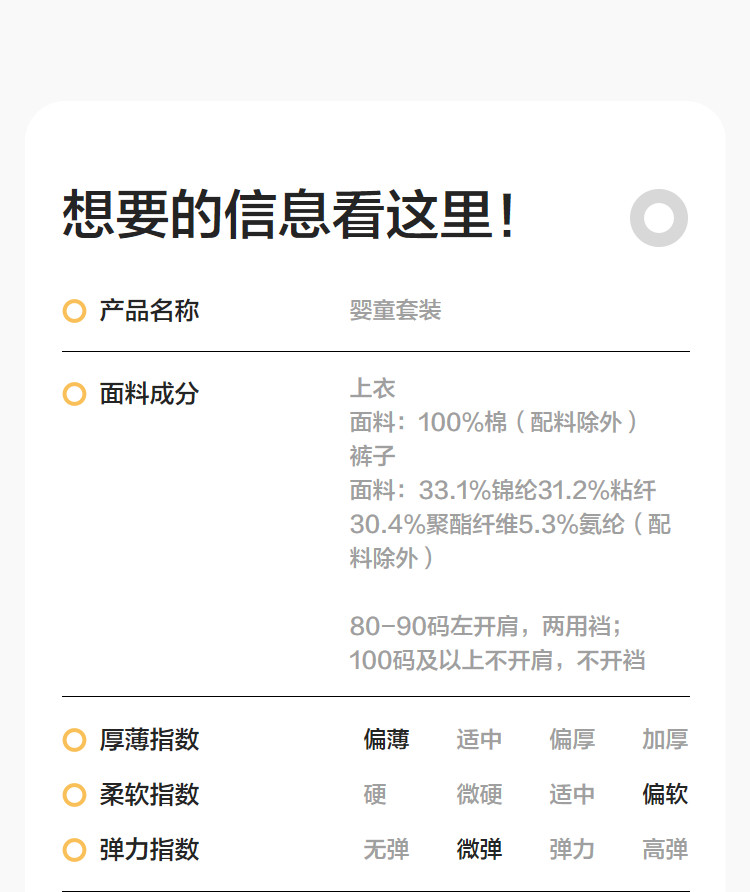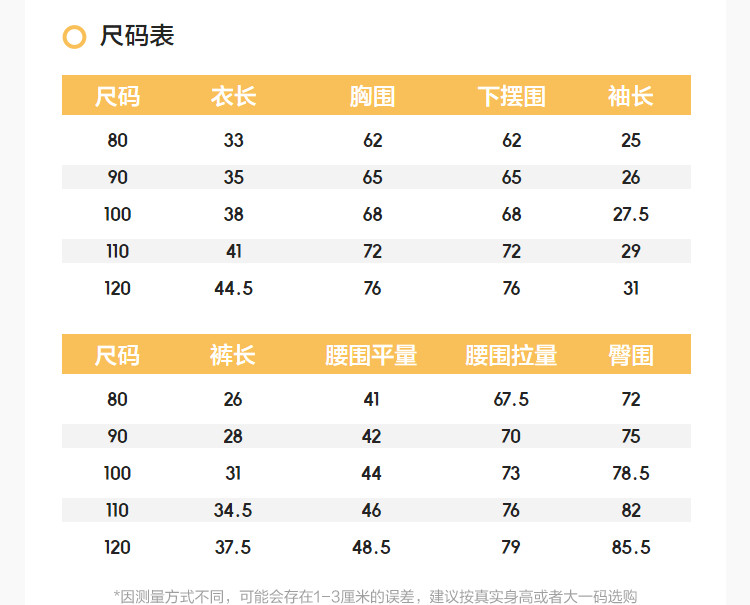 | 尺码 | 袖长(cm) | 适合年龄 | 衣长(cm) | 身高(cm) | 腰围(cm) | 裤长(cm) | 臀围(cm) | 胸围(cm) | 号型 |
