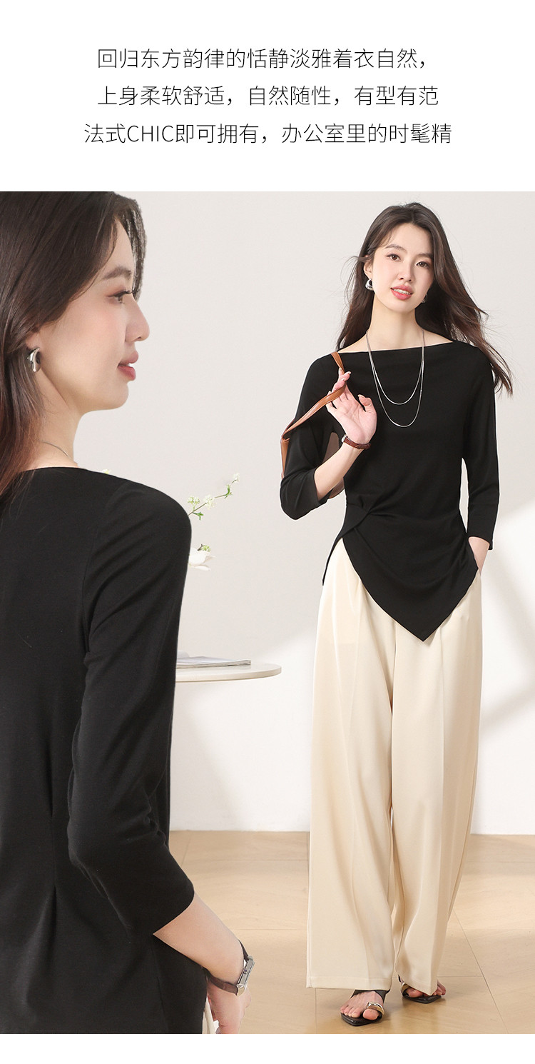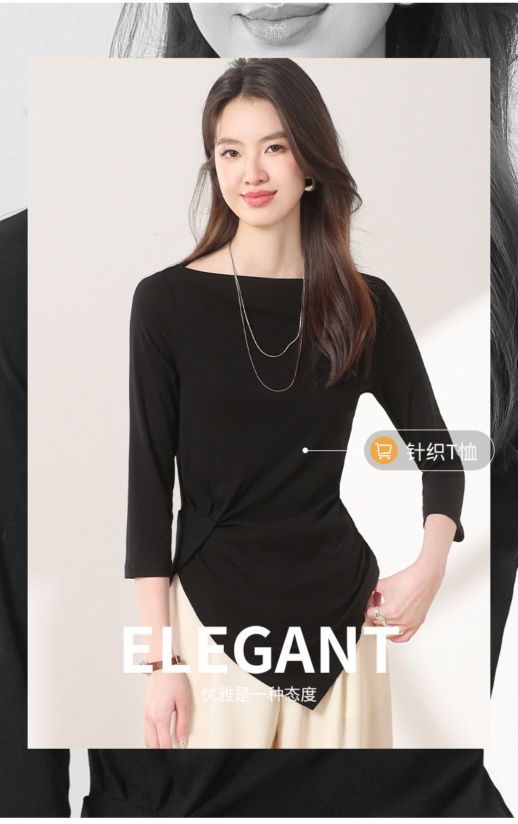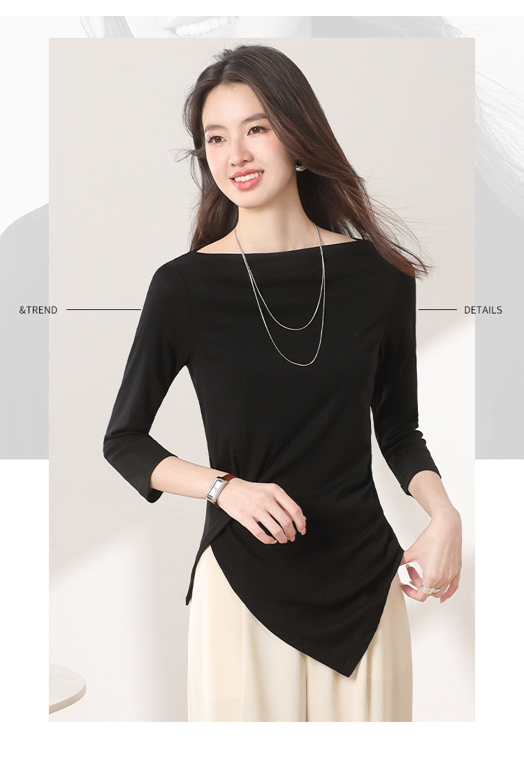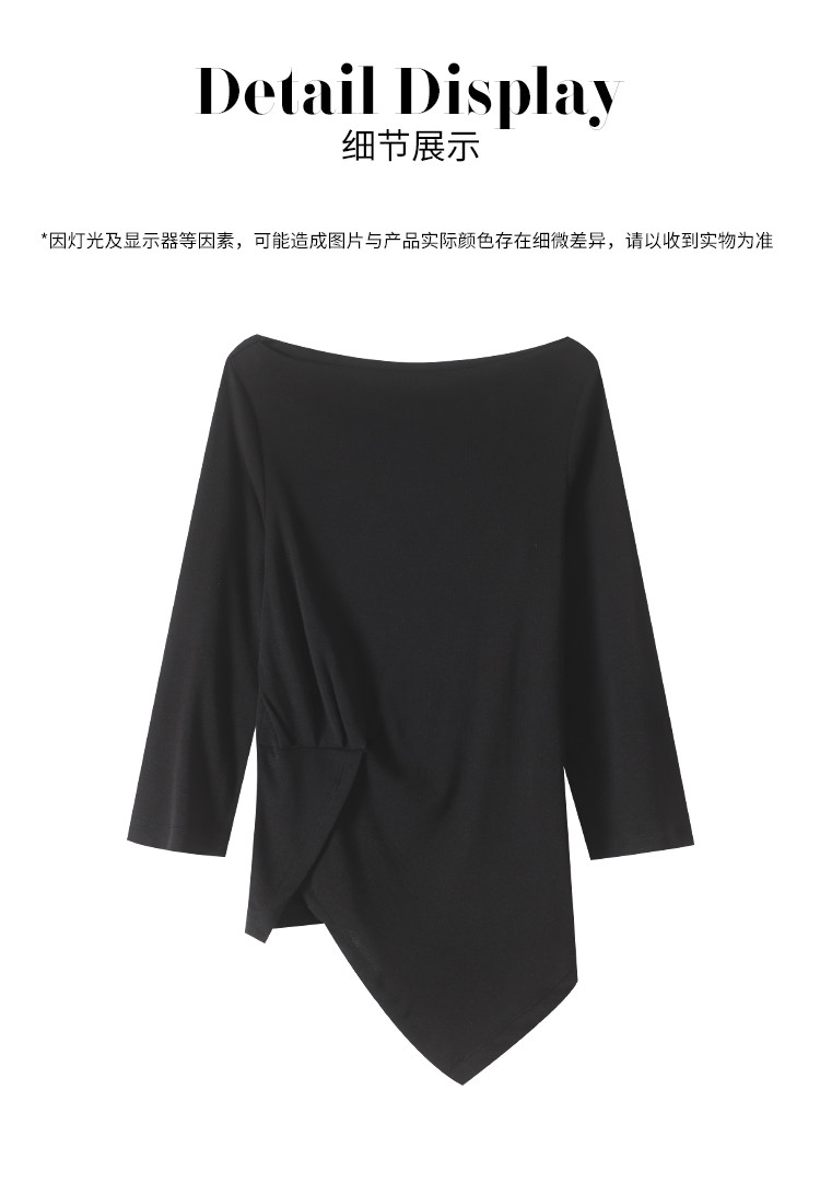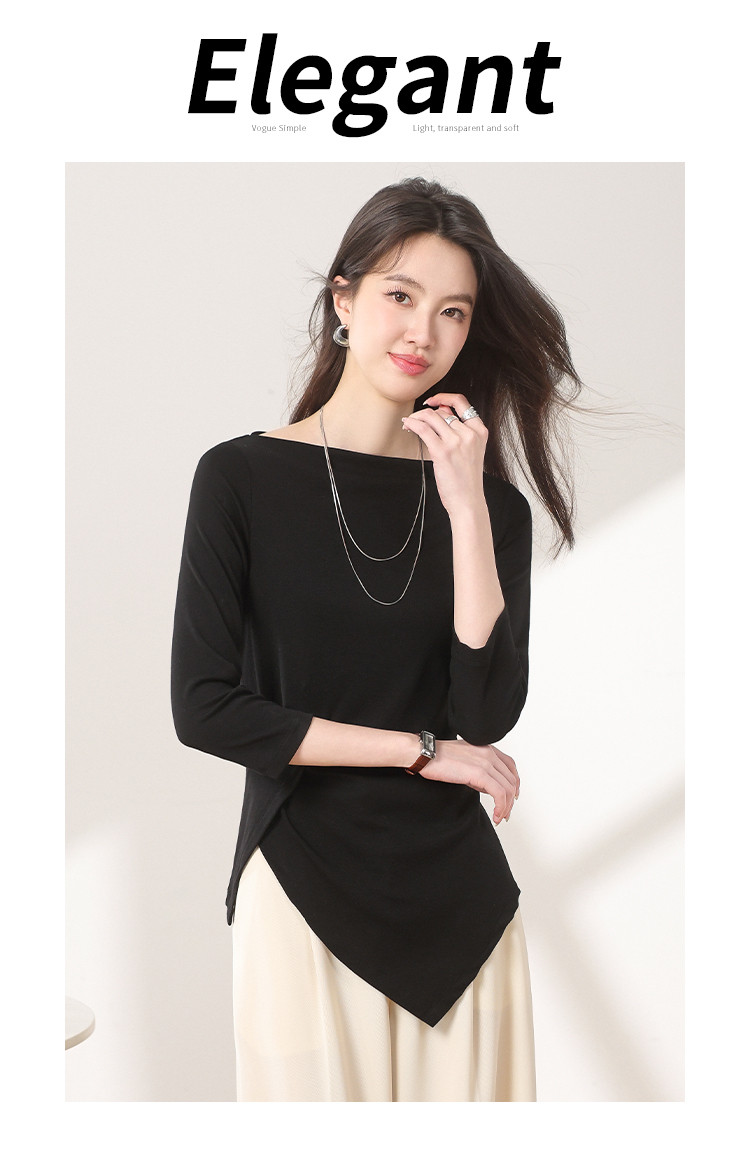 商品名称:【含桑蚕丝】法式一字领纯色薄款针织衫女简约休闲长袖不规则T恤 595475