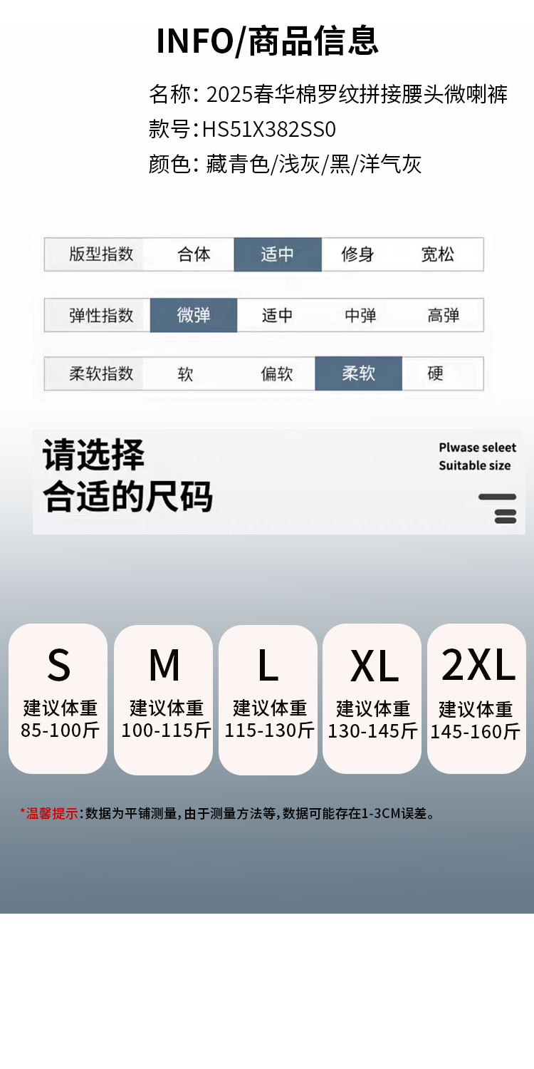 | 尺码 | 大腿围(cm) | 裤脚围(cm) | 前浪(cm) | 后浪(cm) | 腰围(cm) | 裤长(cm) | 膝围(cm) | 臀围(cm) | 号型 |