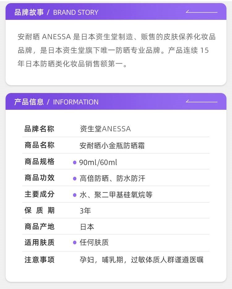 商品名称:【买一送一】ANESSA/安耐晒 小金瓶防晒霜 60ml\90ml 新旧版本混发