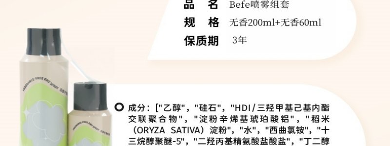 商品名称:Befe 无香干发喷雾套装 200ml+60ml
