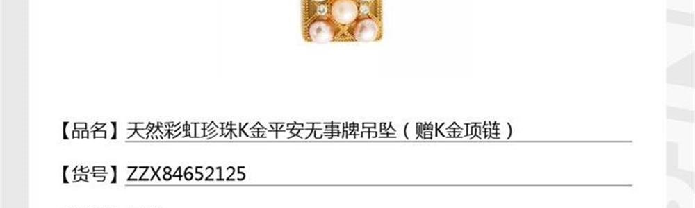 商品名称:中国金楼 梵尚品 天然彩虹珍珠K金平安无事牌吊坠(赠K金项链)