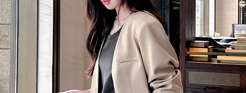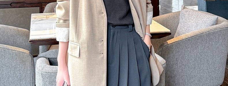 mashluxy 袖口蕾丝腰带收腰显瘦西装 卡其色 L码