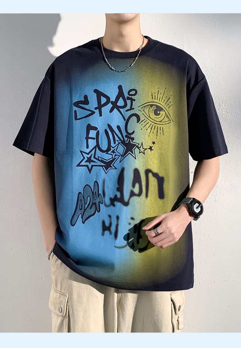 型煜 短袖T恤男夏装新款宽松休闲创意拼色印花情侣装
